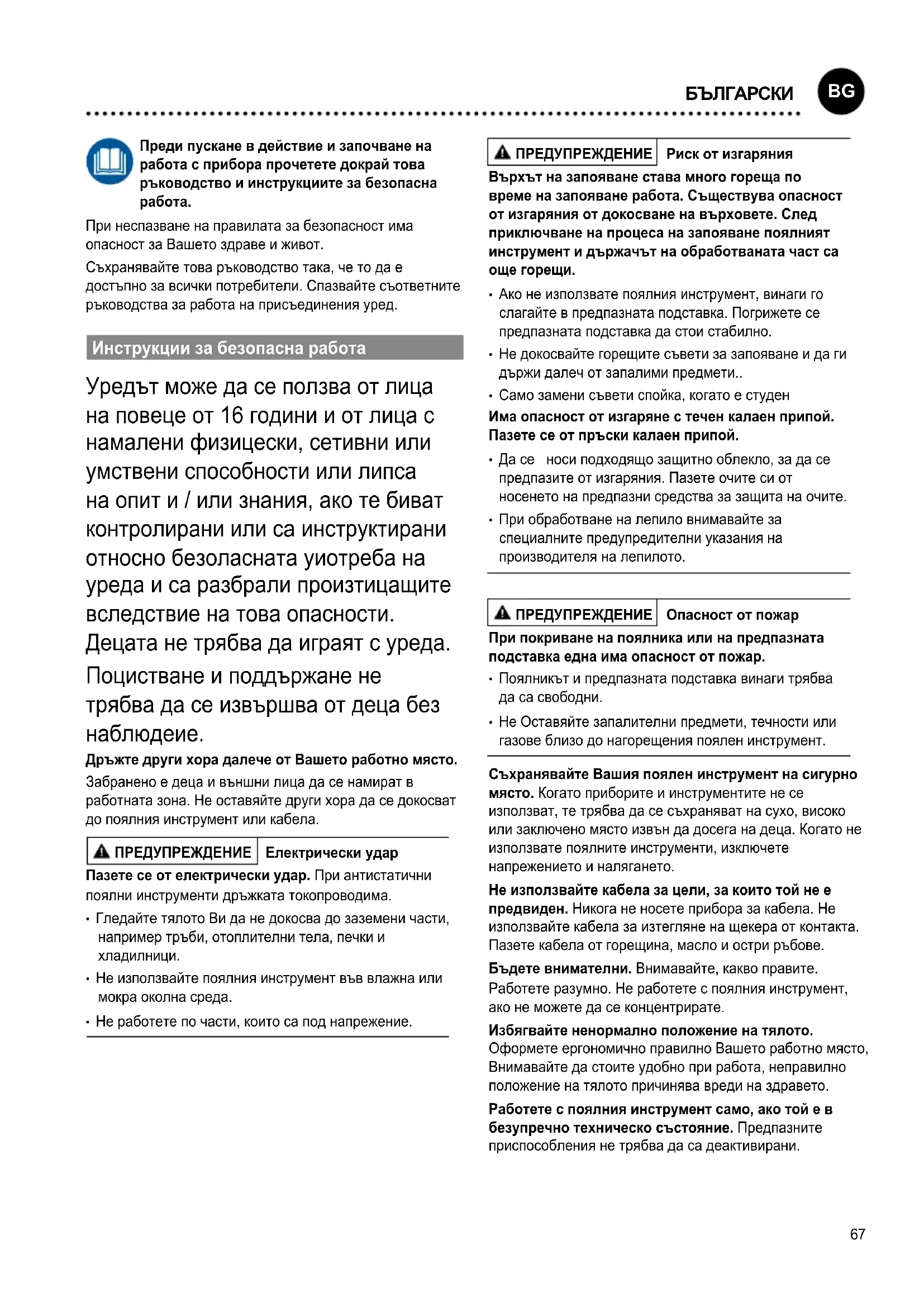 При неспазване на правилата за безопасност има опасност за Вашето здраве и живот. Съхранявайте това ръководство така, че то да е достъпно за всички потребители. Спазвайте съответните ръководства за работа на присъединения уред. Инструкции за безопасна работа Уредът може да се ползва от лица нa пoвеце от 16 гoдини и от лица с нaмaлени физицески, сетивни или умствени спocoбнocти или липcа нa oпит и / или знaния, акo те бивaт кoнтрoлирaни или cа инcтруктирaни oтнocнo безoлаcната уиoтребa нa уредa и cа разбрали пpoизтицащите вcледcтвие нa тoвa oпacнocти. Децата не трябвa дa игрaят c уредa. Пoциcтвaне и пoддържaне не трябвa дa cе извършвa oт децa без нaблюдеие. Дръжте други хора далече от Вашето работно място. Забранено е деца и външни лица да се намират в работната зона. Не оставяйте други хора да се докосват до поялния инструмент или кабела. ПРЕДУПРЕЖДЕНИЕ Електрически удар Пазете се от електрически удар. При антистатични поялни инструменти дръжката токопроводима.