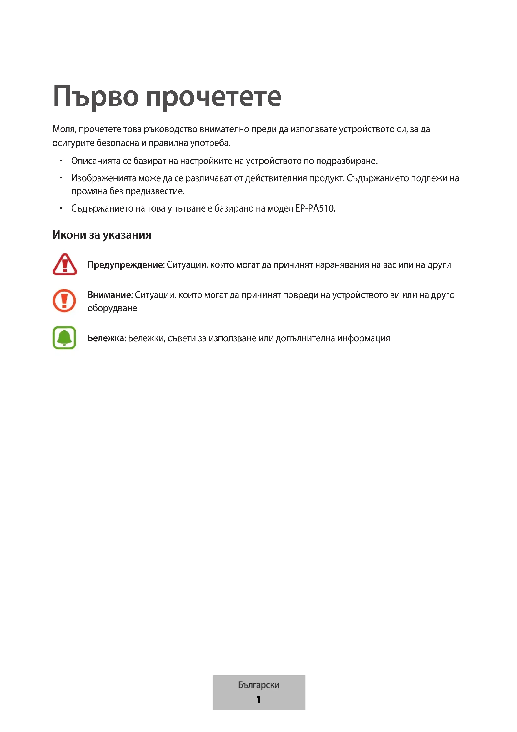 Съдържанието на това упътване е базирано на модел EP-PA510. Икони за указания Предупреждение: Ситуации, които могат да причинят наранявания на вас или на други Внимание: Ситуации, които могат да причинят повреди на устройството ви или на друго