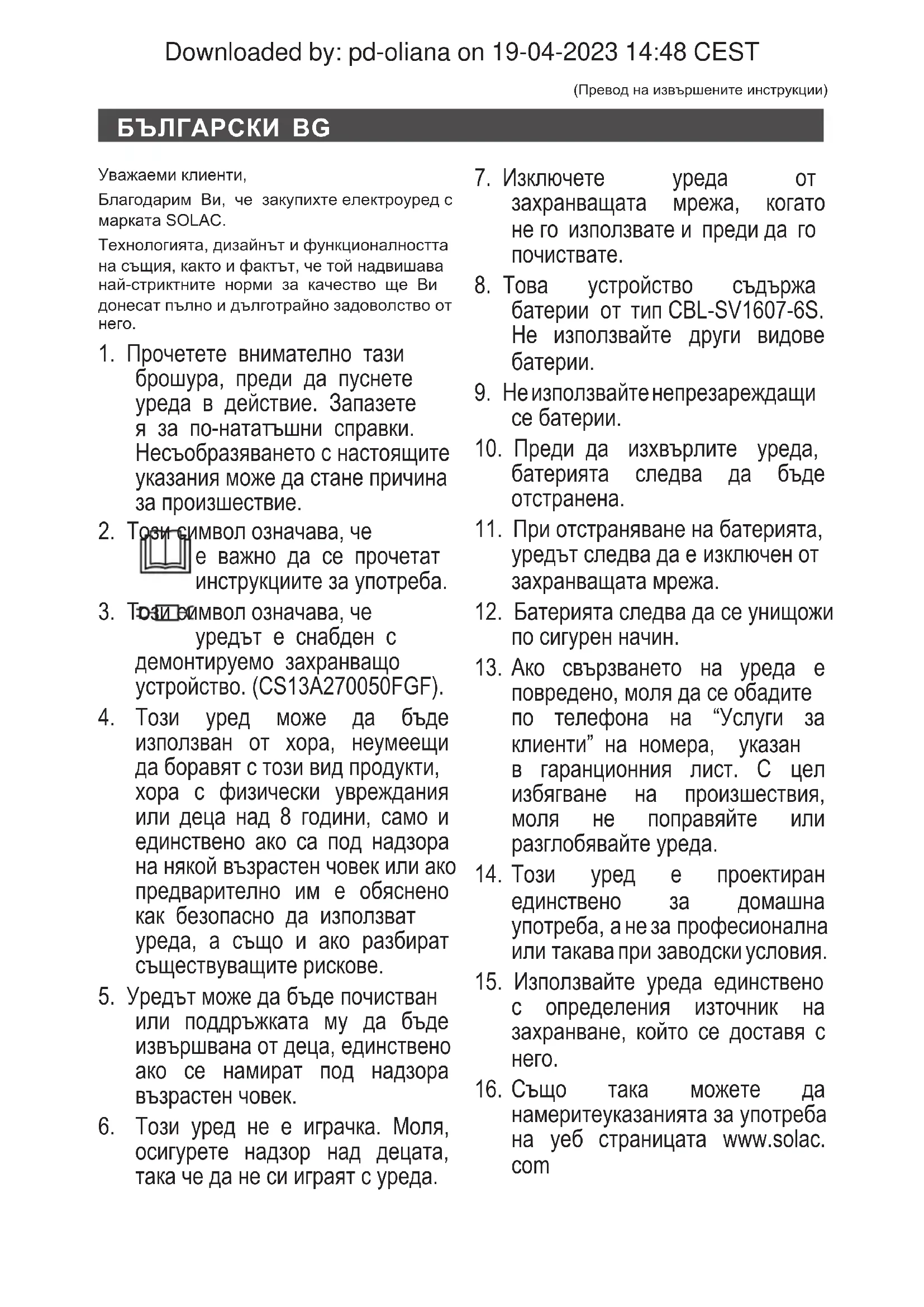 намеритеуказанията за употреба на уеб страницата www.solac. com Downloaded by: pd-oliana on 19-04-2023 14:48 CEST(Превод на извършените инструкции)