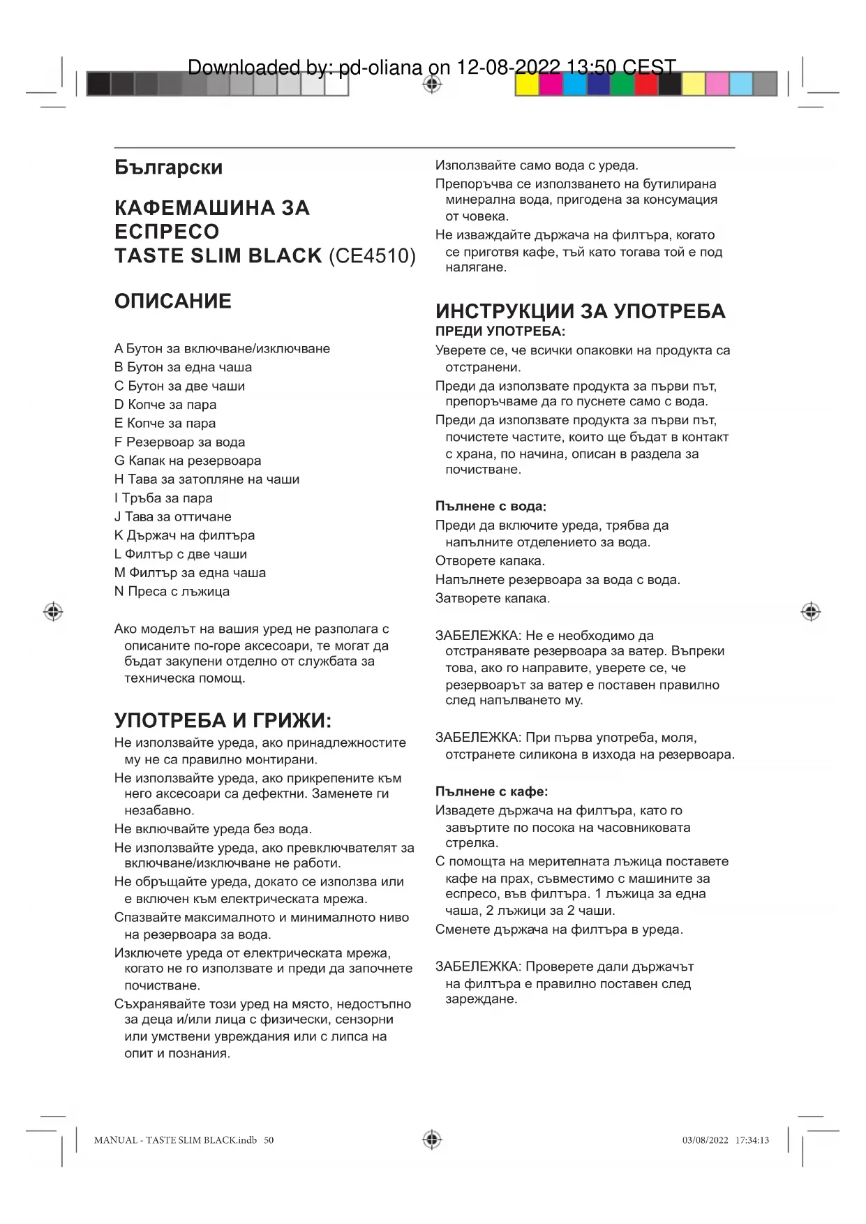 РЪКОВОДСТВО ЗА ПОТРЕБИТЕЛЯ Taste Slim Black CE4510 SOLAC