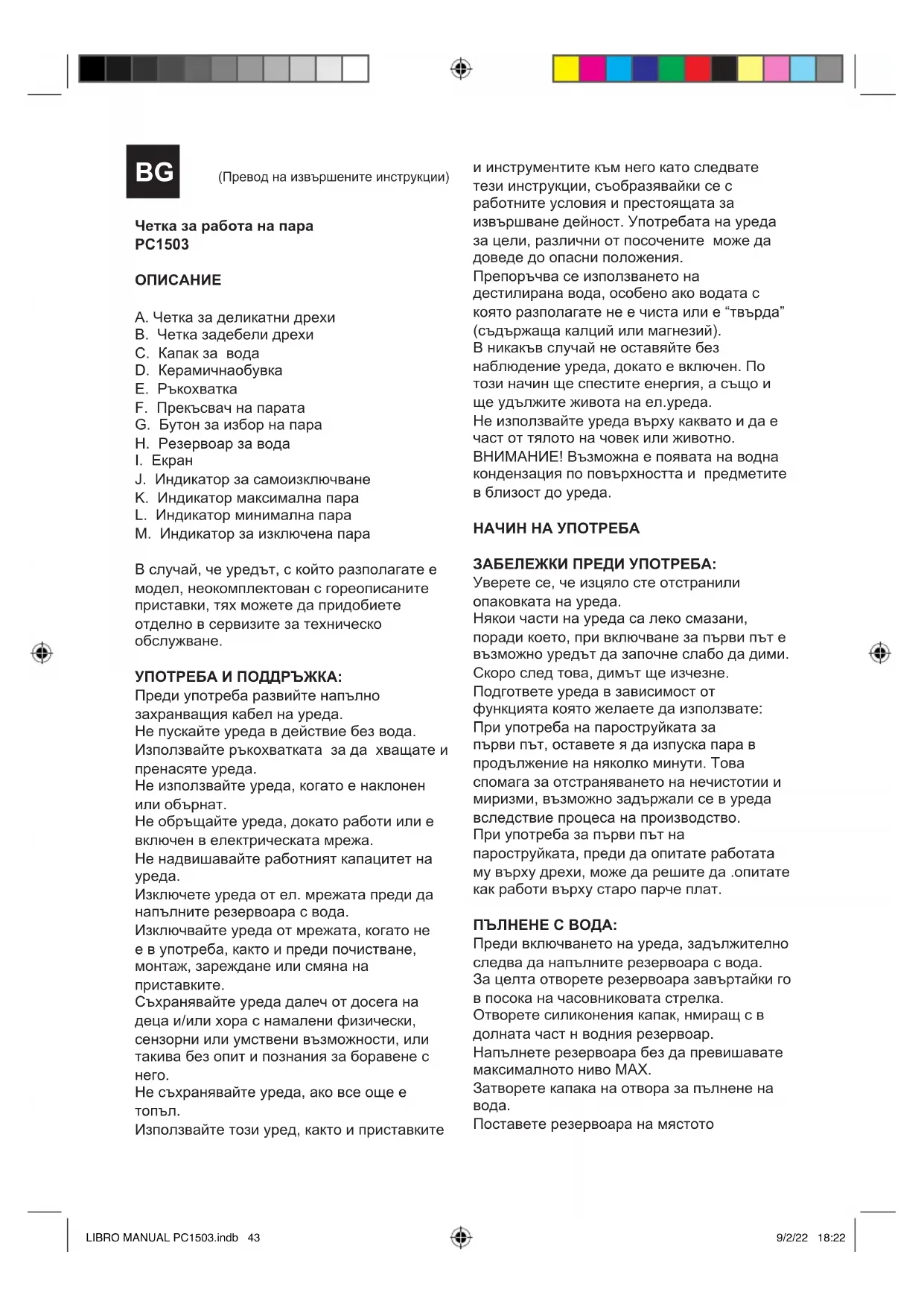 Натиснетебутоназаизбор на пара в продължение на няколко секунди. Ще видите, че свитлината на уреда се изключвá. Изключете уреда от захранващата мрежа. Източете водата от резервоара. Оставете го да изстине Почистете уреда. НАПАСВАНЕ НА ПРИСТАВКАТА Вниманиe. Преди да поставяте или сваляте приставки, винаги оставяйте пароструйката да изстине. Поставяне на приставки. 1 Подравнете долната част, изпъкваща от четката за плат към долния процеп на главата за пара. 2 Натиснете приставката, докато горната, подаваща се част, също щракне в горния процеп на главата за пара. САМОИЗКЛЮЧВАЩ СЕ Акоизделието не се използва в продължение на 20 минути, ще се включи светлинен индикатор „AUTO- OFF“ (червен LIBRO MANUAL PC1503.indb 44LIBRO MANUAL PC1503.indb 44 9/2/22 18:229/2/22 18:22Примигващ),, след което изделието се изключва автоматично. ТЕРМОЗАЩИТА ПРИ ПРЕГРЯВАНЕ: Уредът е снабден със защитен механизъм, предпазващ го от всякакъв вид прегряване. Ако уредът се изключи автоматично и не се включи повторно, извадете щепсела от ел. контакт, изчакайте около 15 минути и отново го включете. Ако пак не работи, обърнете се към оторизиран сервиз за техническо обслужване. ПОЧИСТВАНЕ НА КОТЛЕНИЯ КАМЪК В случай, че уредът започне да произвежда пара по-бавно, или престане да произвежда пара, след което започне отново да го прави, възможно е това да е знак, че уредът следва да се декалцифицира. Отстраняването на котления камък означава да се премахнат калциевите отлагания, образували се с течение на времето в металните части на пароструйката. За да поддържате оптимална ефективност на работа, моля почиствайте периодично котления камък. Честотата на почистване зависи от твърдостта на използваната вода и от честотата, с която се използвауредът