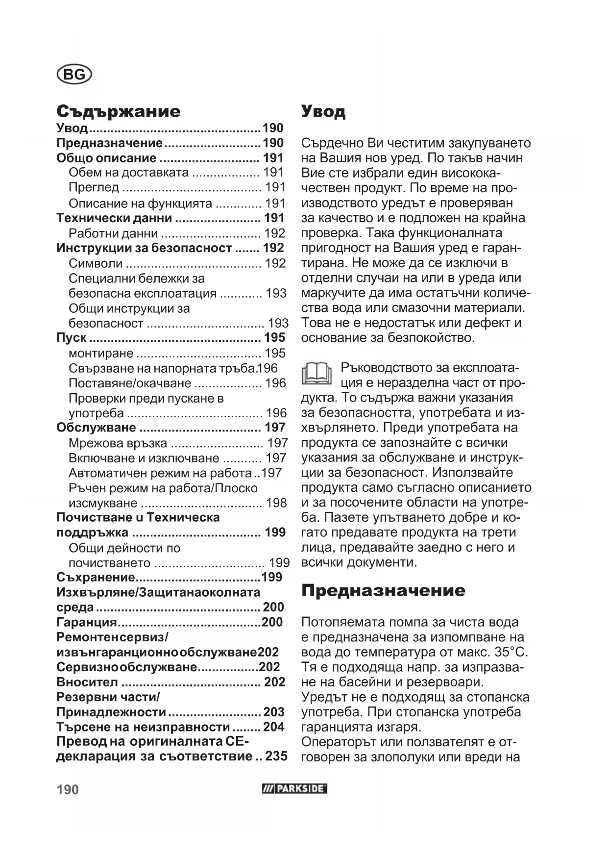 Сърдечно Ви честитим закупуването на Вашия нов уред. По такъв начин Вие сте избрали един високока- чествен продукт. По време на про- изводството уредът е проверяван за качество и е подложен на крайна проверка. Така функционалната пригодност на Вашия уред е гаран- тирана. Не може да се изключи в отделни случаи на или в уреда или маркучите да има остатъчни количе- ства вода или смазочни материали. Това не е недостатък или дефект и основание за безпокойство. Ръководството за експлоата- ция е неразделна част от про- дукта. То съдържа важни указания за безопасността, употребата и из- хвърлянето. Преди употребата на продукта се запознайте с всички указания за обслужване и инструк- ции за безопасност. Използвайте продукта само съгласно описанието и за посочените области на употре- ба. Пазете упътването добре и ко- гато предавате продукта на трети лица, предавайте заедно с него и всички документи. Предназначение Потопяемата помпа за чиста вода е предназначена за изпомпване на вода до температура от макс. 35°C. Тя е подходяща напр. за изпразва- не на басейни и резервоари. Уредът не е подходящ за стопанска употреба. При стопанска употреба гаранцията изгаря. Операторът или ползвателят е от- говорен за злополуки или вреди на