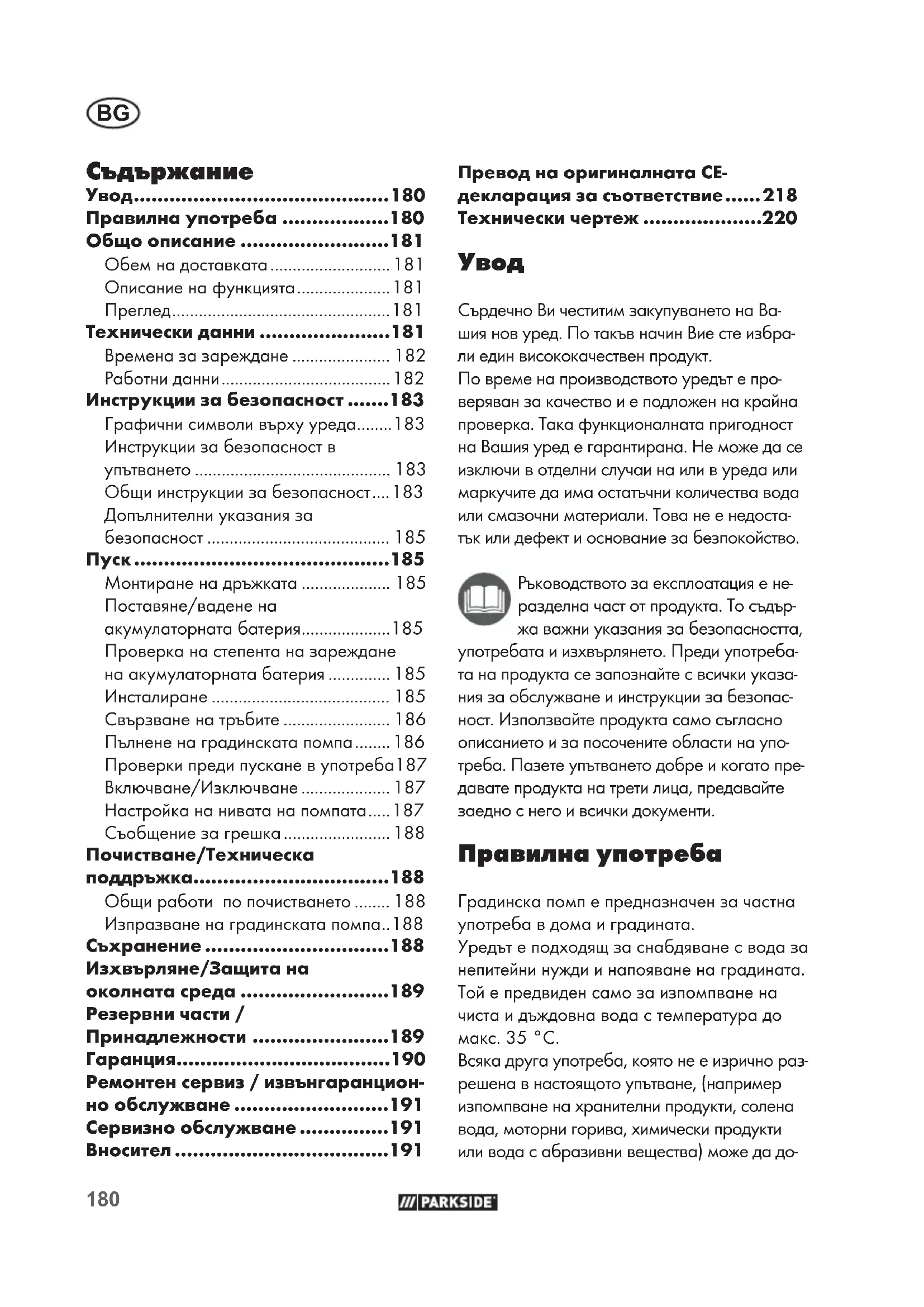 Сърдечно Ви честитим закупуването на Ва- шия нов уред. По такъв начин Вие сте избра- ли един висококачествен продукт. По време на производството уредът е про- веряван за качество и е подложен на крайна проверка. Така функционалната пригодност на Вашия уред е гарантирана. Не може да се изключи в отделни случаи на или в уреда или маркучите да има остатъчни количества вода или смазочни материали. Това не е недоста- тък или дефект и основание за безпокойство. Ръководството за експлоатация е не- разделна част от продукта. То съдър- жа важни указания за безопасността, употребата и изхвърлянето. Преди употреба- та на продукта се запознайте с всички указа- ния за обслужване и инструкции за безопас- ност. Използвайте продукта само съгласно описанието и за посочените области на упо- треба. Пазете упътването добре и когато пре- давате продукта на трети лица, предавайте заедно с него и всички документи. Правилна употреба Градинска помп е предназначен за частна употреба в дома и градината. Уредът е подходящ за снабдяване с вода за непитейни нужди и напояване на градината. Той е предвиден само за изпомпване на чиста и дъждовна вода с температура до макс. 35°C. Всяка друга употреба, която не е изрично раз- решена в настоящото упътване, (например изпомпване на хранителни продукти, солена вода, моторни горива, химически продукти или вода с абразивни вещества) може да до-