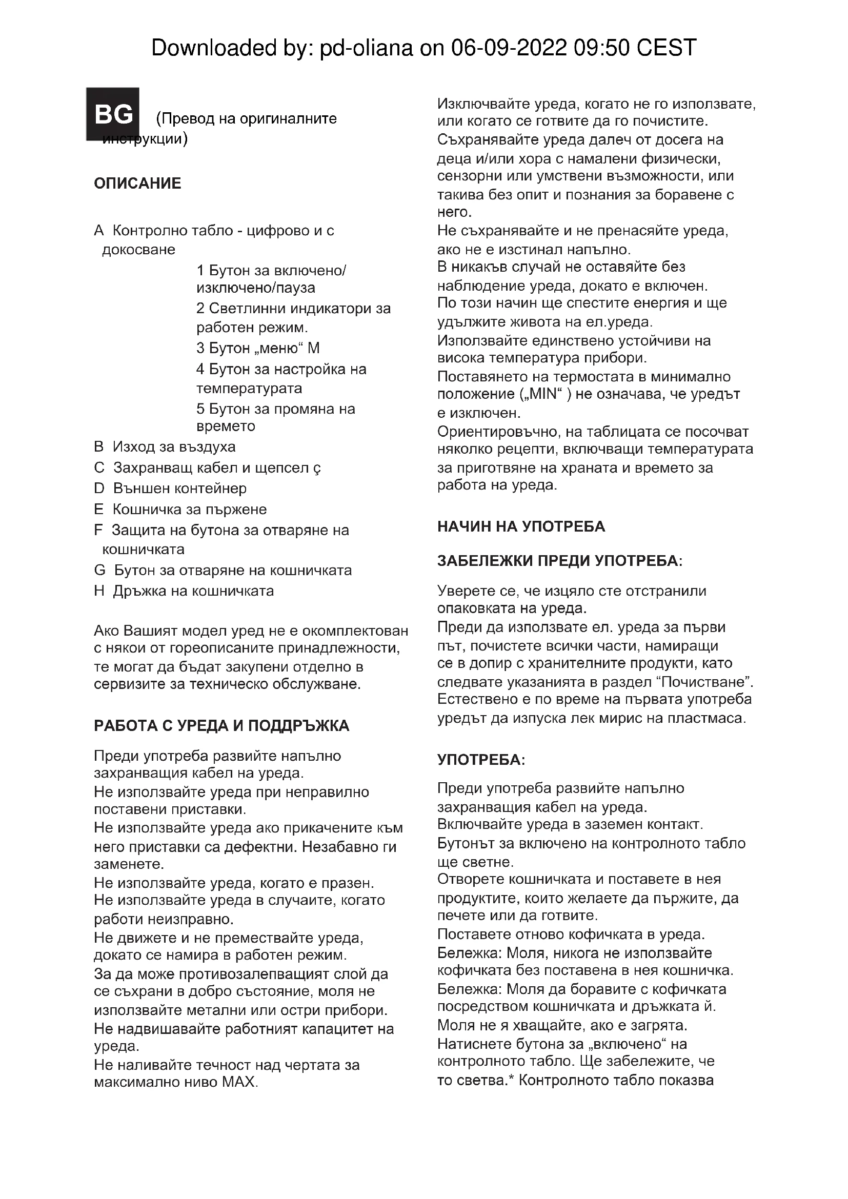 Downloaded by: pd-oliana on 06-09-2022 09:50 CESTПроблем Възможна причина Разрешение на проблема Фритюрникът не