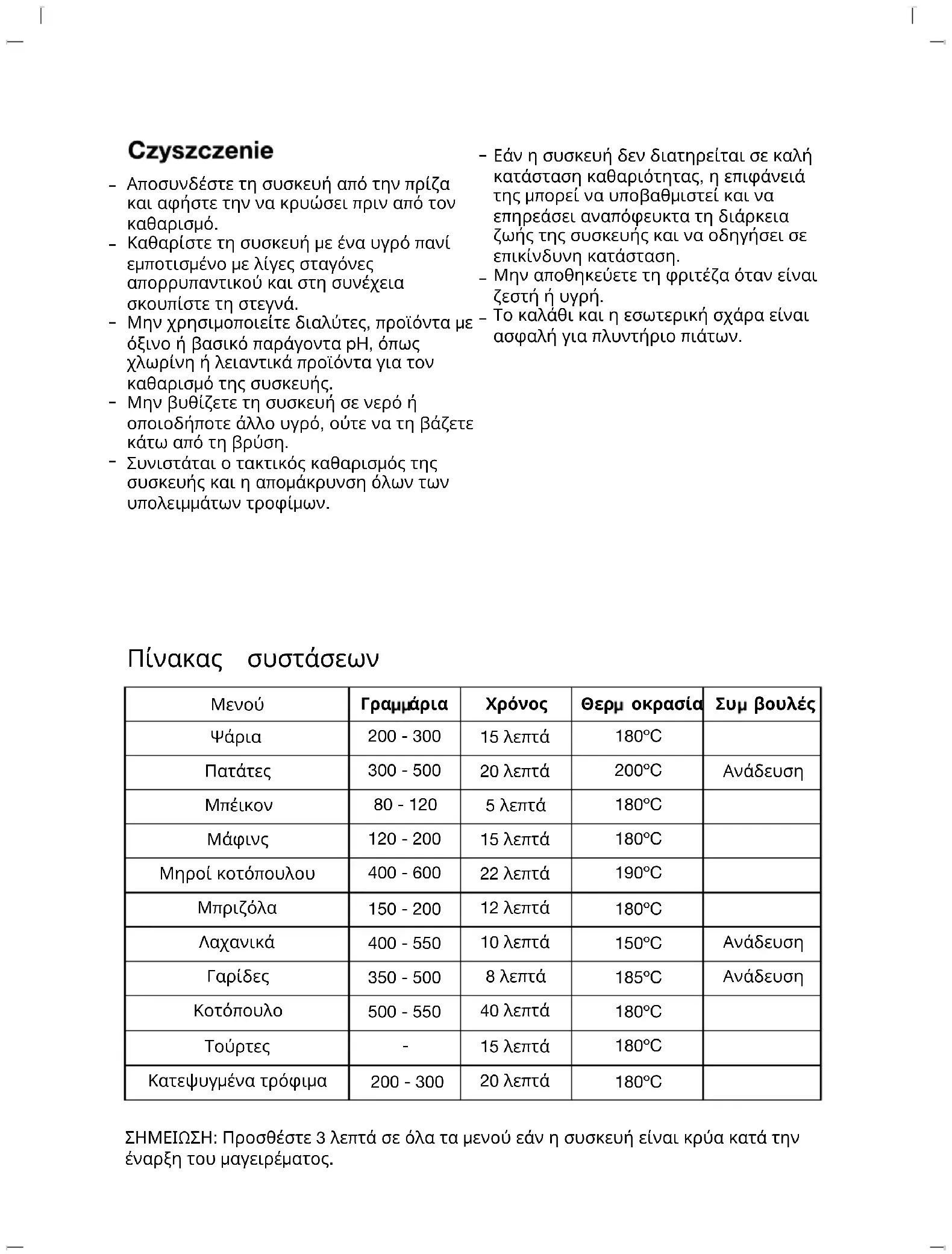 Таблица с препоръки ЗАБЕЛЕЖКА: Добавете 3 минути към всички менюта, ако уредът е студен в началото на готвенето. Не използвайте разтворители, продукти с киселинен или основен pH фактор, като белина, или абразивни продукти за почистване на уреда. Не потапяйте уреда във вода или друга течност, нито го поставяйте под