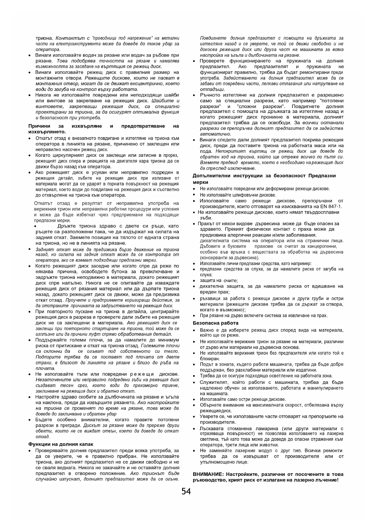 Дръжте триона за изолираните повърхности, предназначени за тази цел, по време на работа, при която въртящият се режещ диск може да влезе в контакт с проводници под напрежение или със захранващия кабел на54 триона. Контактът с "проводници под напрежение" на метални части на електроинструмента може да доведе до токов удар за