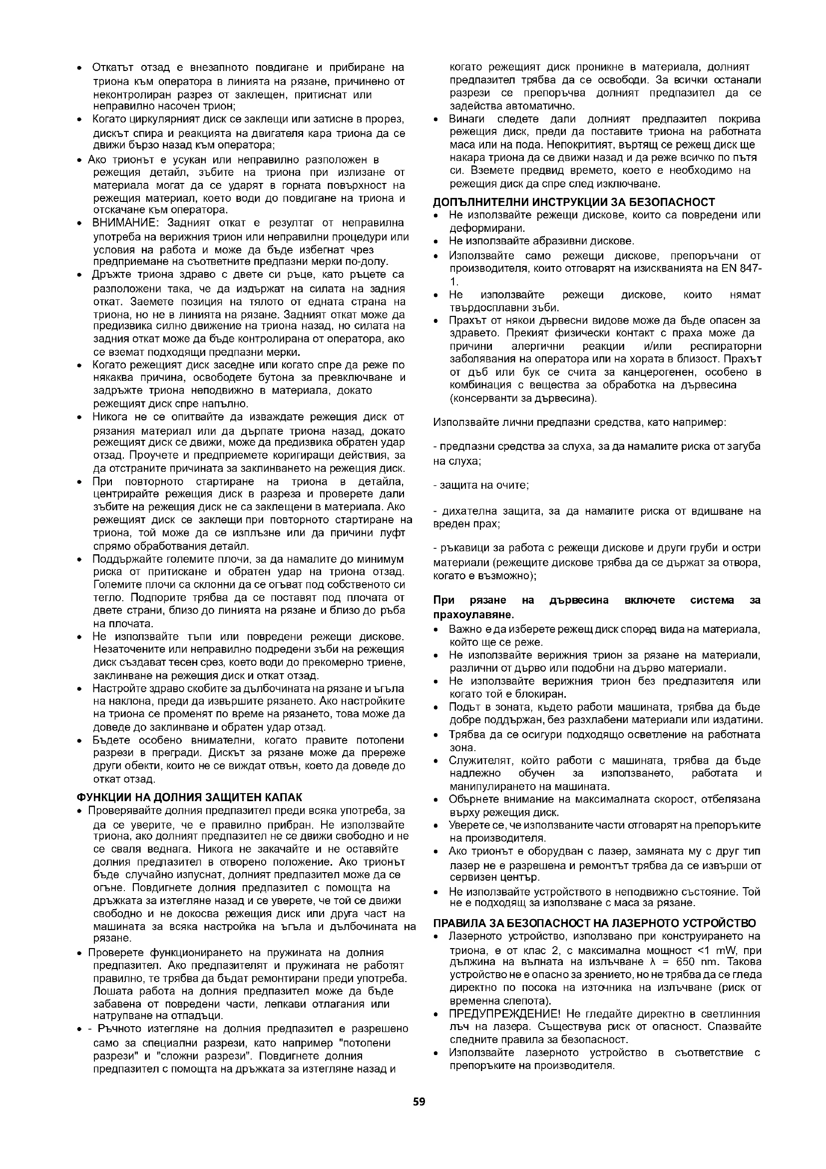 - Винаги следете дали долният предпазител покрива режещия диск, преди да поставите триона на работната маса или на пода. Непокритият, въртящ се режещ диск ще накара триона да се движи назад и да реже всичко по пътя си. Вземете предвид времето, което е необходимо на режещия диск да спре след изключване. ДОПЪЛНИТЕЛНИ ИНСТРУКЦИИ ЗА БЕЗОПАСНОСТ