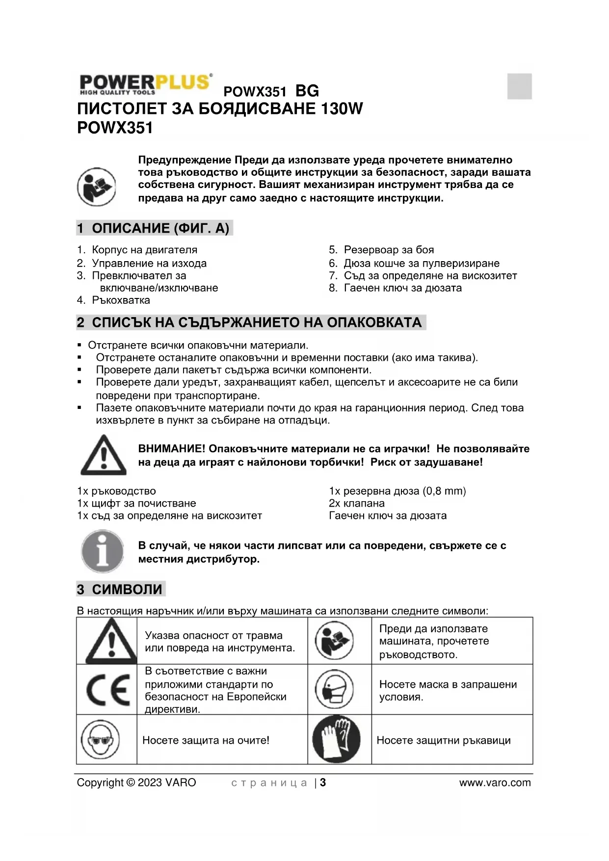12 ГАРАНЦИЯ .................................................................................... 12 13 ОКОЛНА СРЕДА ........................................................................... 12 14 ДЕКЛАРАЦИЯ ЗА СЪОТВЕТСТВИЕ ......................................... 13POWX351 BG Copyright © 2023 VARO с т р а н и ц а | 3 www.varo.com ПИСТОЛЕТ ЗА БОЯДИСВАНЕ 130W POWX351 Предупреждение Преди да използвате уреда прочетете внимателно това ръководство и общите инструкции за безопасност, заради вашата собствена сигурност. Вашият механизиран инструмент трябва да се предава на друг само заедно с настоящите инструкции. 1 ОПИСАНИЕ (ФИГ. A)