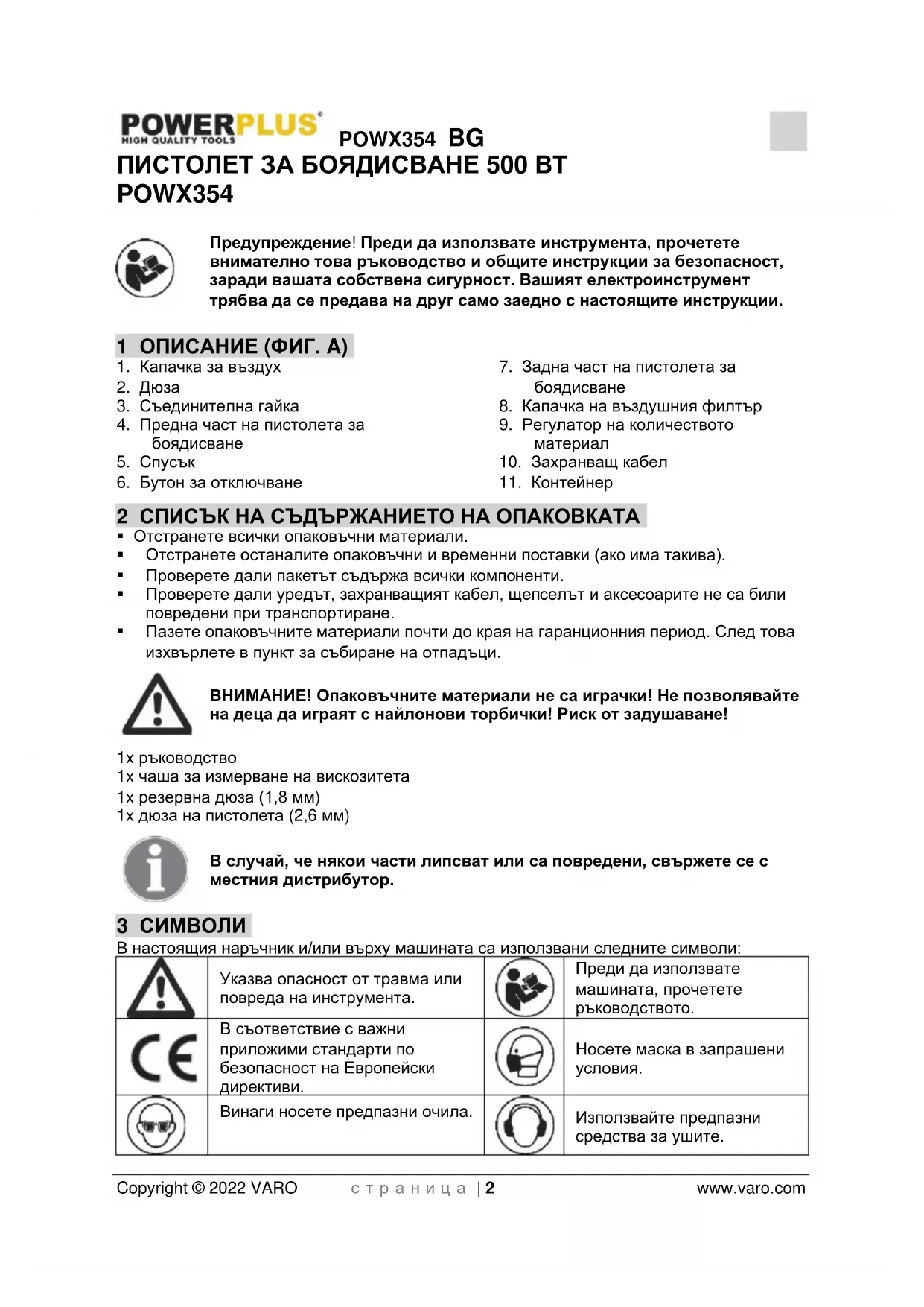 Не изискват разрежданеPOWX354 BG Copyright © 2022 VARO с т р а н и ц а | 7 www.varo.com Ако, за да изтече, на боята е необходимо по-дълго време от препоръчаното, тогава е необходимо допълнително разреждане. Добавете и разбъркайте малко количество от подходящия разтворител и използвайте теста за вискозитета, докато постигнете правилната гъстота. Някои материали за пръскане съдържат частици и бучки. Тези материали трябва да бъдат прецедени, преди пълнене на резервоара за боя. Преди да свържете към електрическата мрежа, уверете се, че напрежението съвпада със стойността посочена в обозначителната табела.
