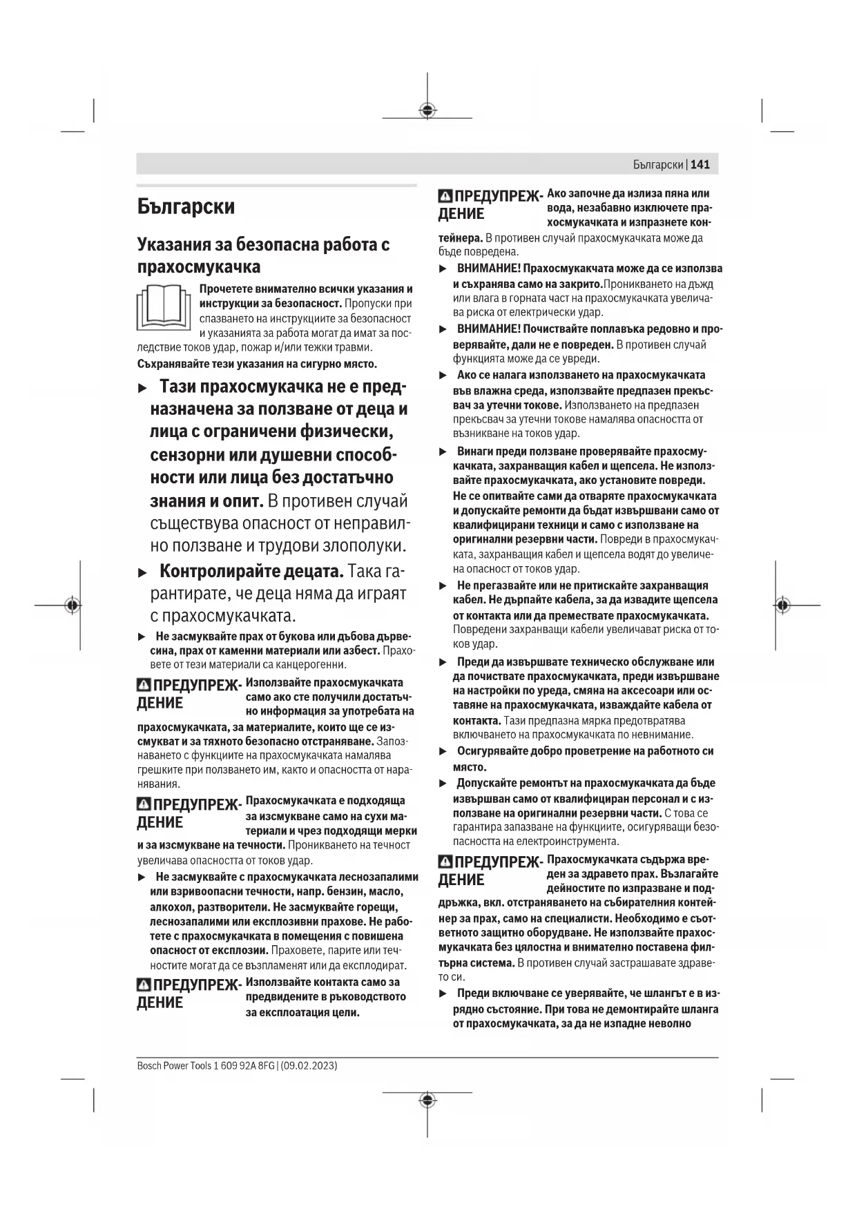 u Преди включване се уверявайте, че шлангът е в из- рядно състояние. При това не демонтирайте шланга от прахосмукачката, за да не изпадне неволно Bosch Power Tools 1 609 92A 8FG | (09.02.2023)142 | Български прах. В противен случай съществува опасност от вдишване на прах. u Не сядайте върху прахосмукачката. Можете да я