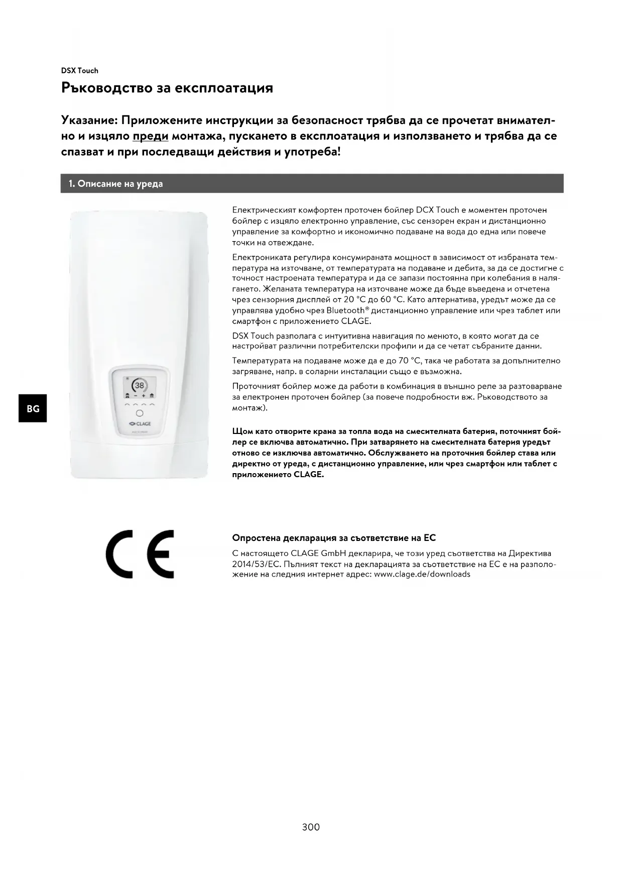 Щом като отворите крана за топла вода на смесителната батерия, поточният бой- лер се включва автоматично. При затварянето на смесителната батерия уредът отново се изключва автоматично. Обслужването на проточния бойлер става или директно от уреда, с дистанционно управление, или чрез смартфон или таблет с приложението CLAGE. Опростена декларация за съответствие на ЕС С настоящето CLAGE GmbH декларира, че този уред съответства на Директива 2014/53/ЕС. Пълният текст на декларацията за съответствие на ЕС е на разполо- жение на следния интернет адрес: www.clage.de/downloadsCLAGE