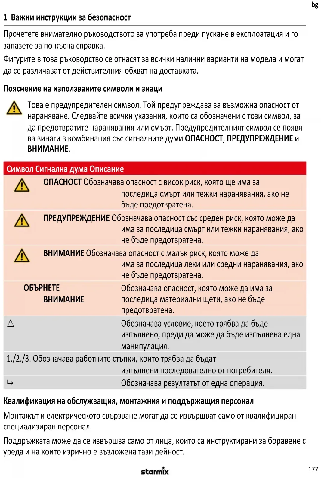 Обозначава резултатът от една операция. Квалификация на обслужващия, монтажния и поддържащия персонал Монтажът и електрическото свързване могат да се извършват само от квалифициран специализиран персонал. Поддръжката може да се извършва само от лица, които са инструктирани за боравене с уреда и на които изрично е възложена тази дейност.178