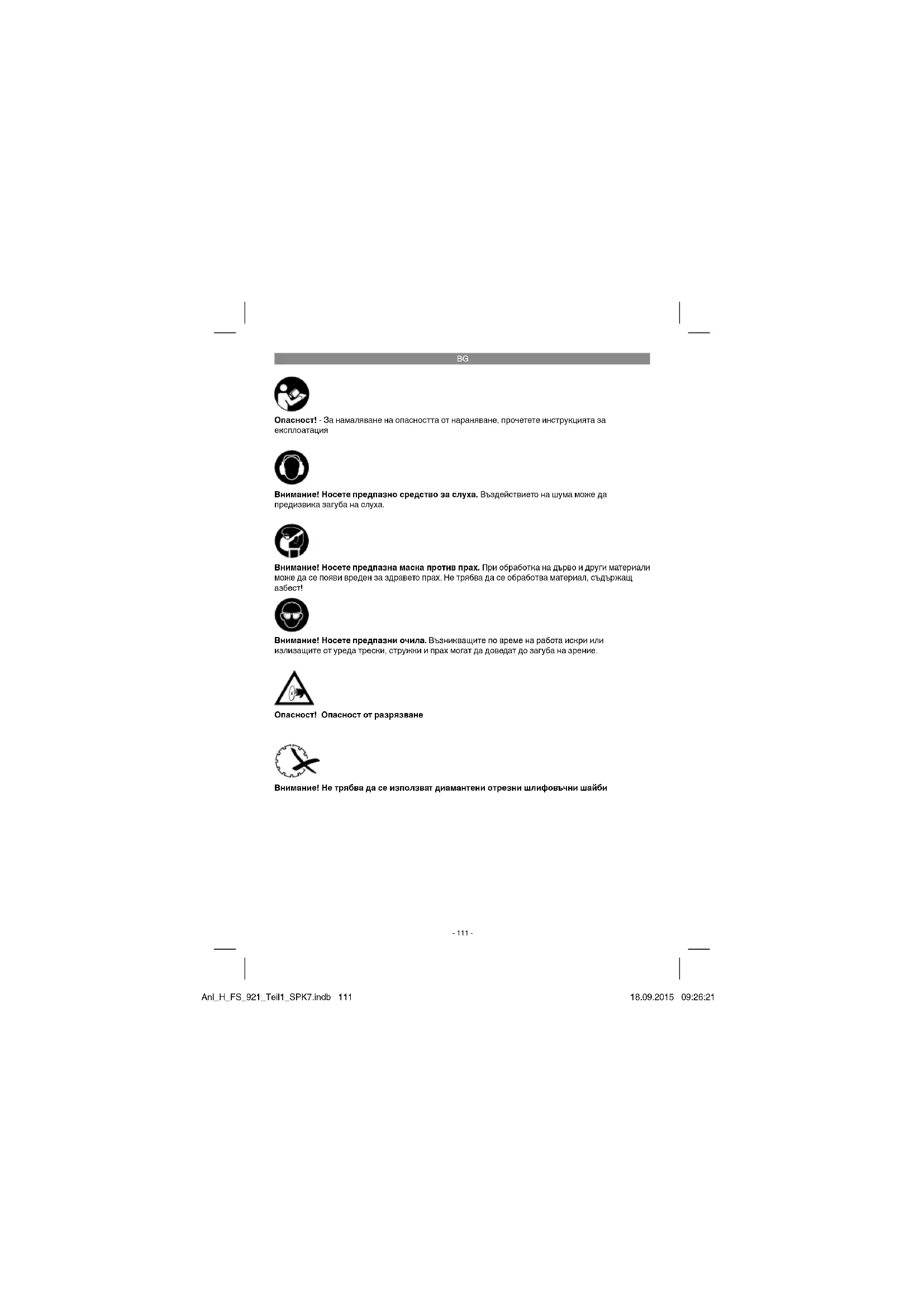 Опасност! Опасност от разрязване Внимание! Не трябва да се използват диамантени отрезни шлифовъчни шайби Опасност! - За намаляване на опасността от нараняване, прочетете инструкцията за експлоатация Внимание! Носете предпазно средство за слуха. Въздействието на шума може да предизвика загуба на слуха. Внимание! Носете предпазни очила. Възникващите по време на работа искри или излизащите от уреда трески, стружки и прах могат да доведат до загуба на зрение. Внимание! Носете предпазна маска против прах. При обработка на дърво и други материали може да се появи вреден за здравето прах. Не трябва да се обработва материал, съдържащ