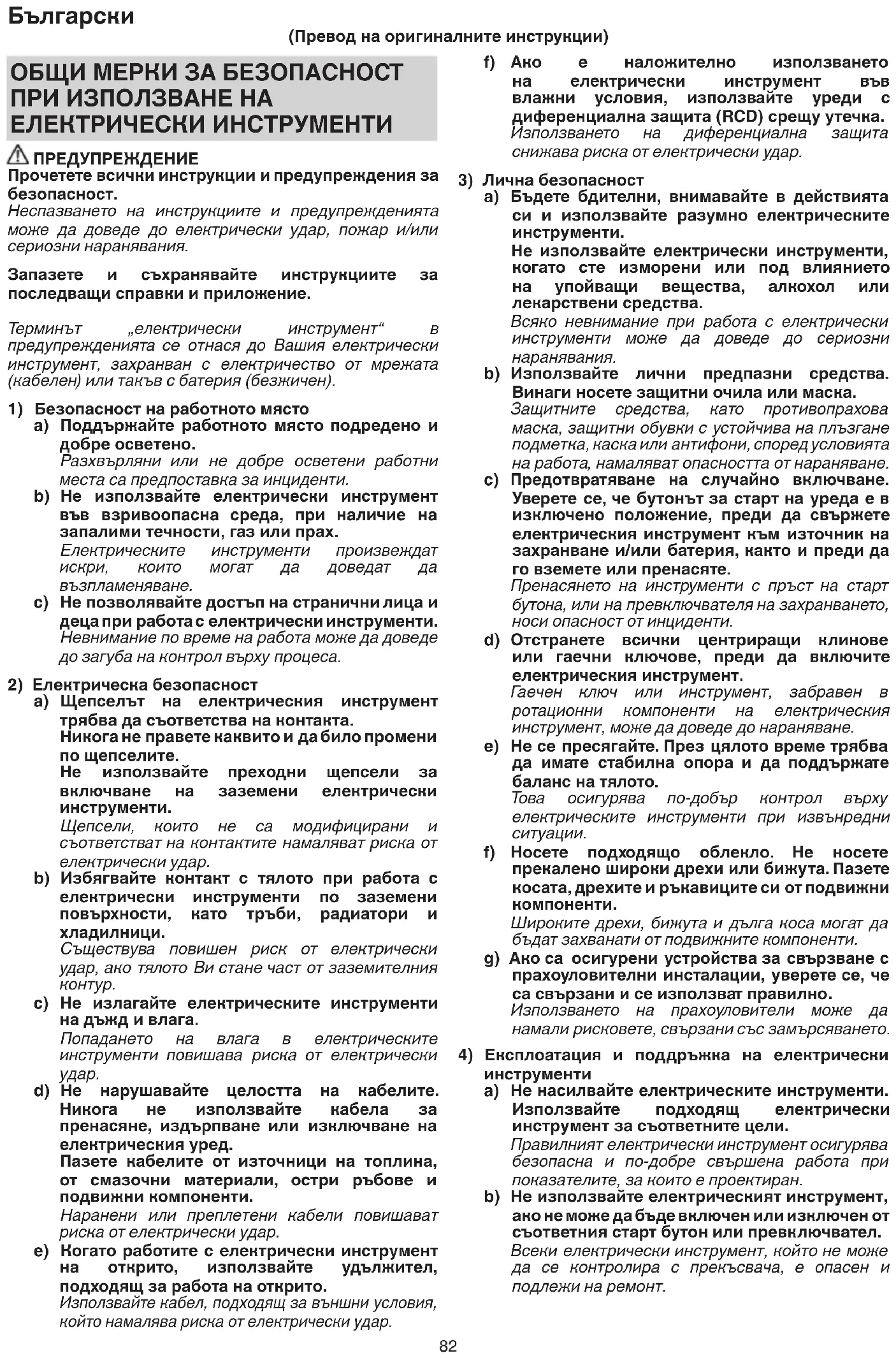 инструменти a) Не насилвайте електрическите инструменти. Използвайте подходящ електрически инструмент за съответните цели. Правилният електрически инструмент осигурява безопасна и по-добре свършена работа при показателите, за които е проектиран. b) Не използвайте електрическият инструмент, ако не може да бъде включен или изключен от съответния старт бутон или превключвател. Всеки електрически инструмент, който не може да се контролира с прекъсвача, е опасен и подлежи на ремонт. ОБЩИ МЕРКИ ЗА БЕЗОПАСНОСТ ПРИ ИЗПОЛЗВАНЕ НА ЕЛЕКТРИЧЕСКИ ИНСТРУМЕНТИ ПРЕДУПРЕЖДЕНИЕ Прочетете всички инструкции и предупреждения за безопасност. Неспазването на инструкциите и предупрежденията може да доведе до електрически удар, пожар и/или сериозни наранявания. Запазете и съхранявайте инструкциите за последващи справки и приложение. Терминът „електрически инструмент“ в предупрежденията се отнася до Вашия електрически инструмент, захранван с електричество от мрежата