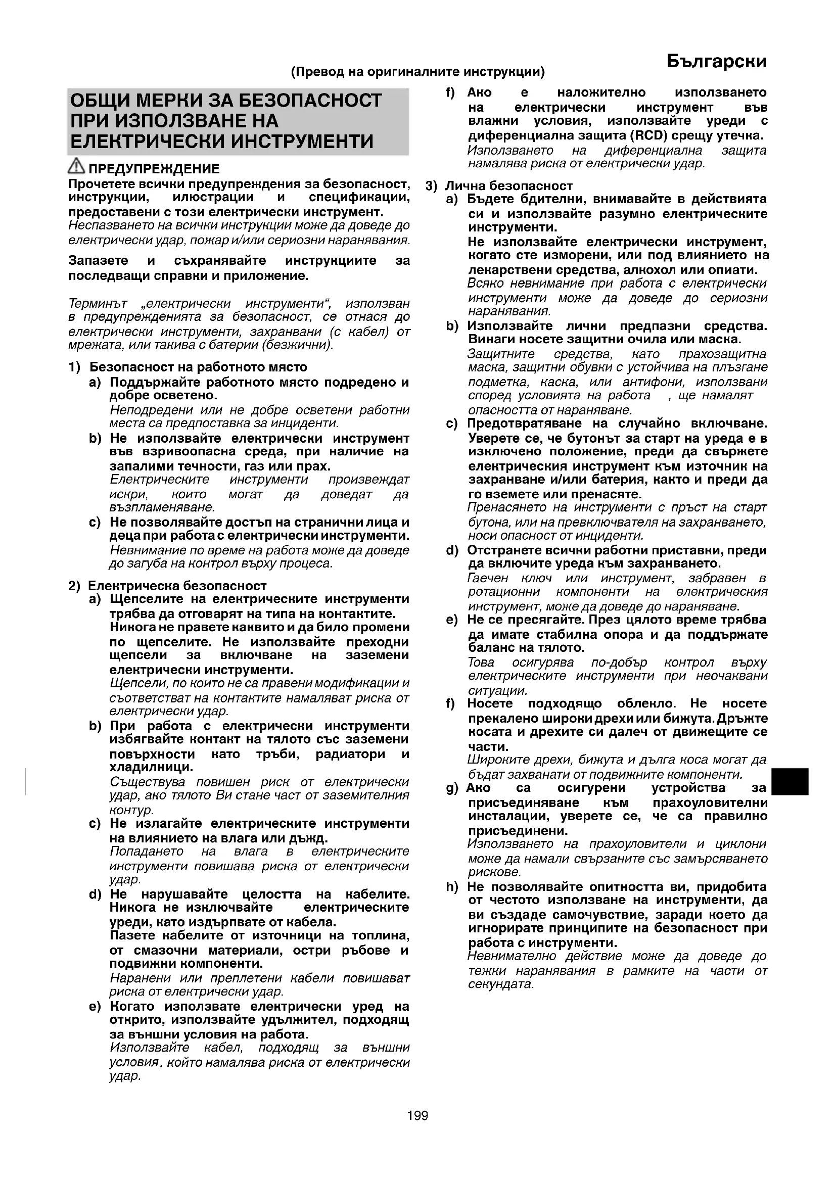 ОБЩИ МЕРКИ ЗА БЕЗОПАСНОСТ ПРИ ИЗПОЛЗВАНЕ НА ЕЛЕКТРИЧЕСКИ ИНСТРУМЕНТИ ПРЕДУПРЕЖДЕНИЕ Прочетете всички предупреждения за безопасност, инструкции, илюстрации и спецификации, предоставени с този електрически инструмент. Неспазването на всички инструкции може да доведе до електрически удар, пожар и/или сериозни наранявания. Запазете и съхранявайте инструкциите за последващи справки и приложение. Терминът „електрически инструменти“, използван в предупрежденията за безопасност, се отнася до електрически инструменти, захранвани (с кабел) от мрежата, или такива с батерии (безжични).