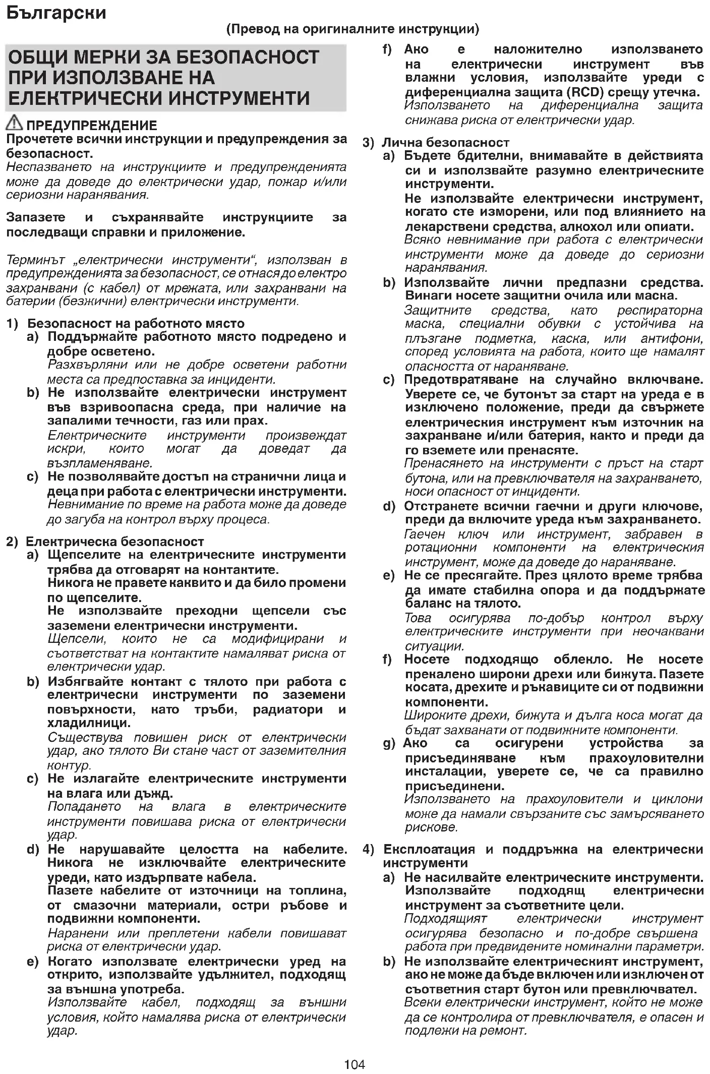 инструменти a) Не насилвайте електрическите инструменти. Използвайте подходящ електрически инструмент за съответните цели. Подходящият електрически инструмент осигурява безопасно и по-добре свършена работа при предвидените номинални параметри. b) Не използвайте електрическият инструмент, ако не може да бъде включен или изключен от съответния старт бутон или превключвател. Всеки електрически инструмент, който не може да се контролира от превключвателя, е опасен и подлежи на ремонт. ОБЩИ МЕРКИ ЗА БЕЗОПАСНОСТ ПРИ ИЗПОЛЗВАНЕ НА ЕЛЕКТРИЧЕСКИ ИНСТРУМЕНТИ ПРЕДУПРЕЖДЕНИЕ Прочетете всички инструкции и предупреждения за безопасност. Неспазването на инструкциите и предупрежденията може да доведе до електрически удар, пожар и/или сериозни наранявания. Запазете и съхранявайте инструкциите за последващи справки и приложение. Терминът „електрически инструменти“, използван в предупрежденията за безопасност, се отнася до електро захранвани (с кабел) от мрежата, или захранвани на батерии (безжични) електрически инструменти.