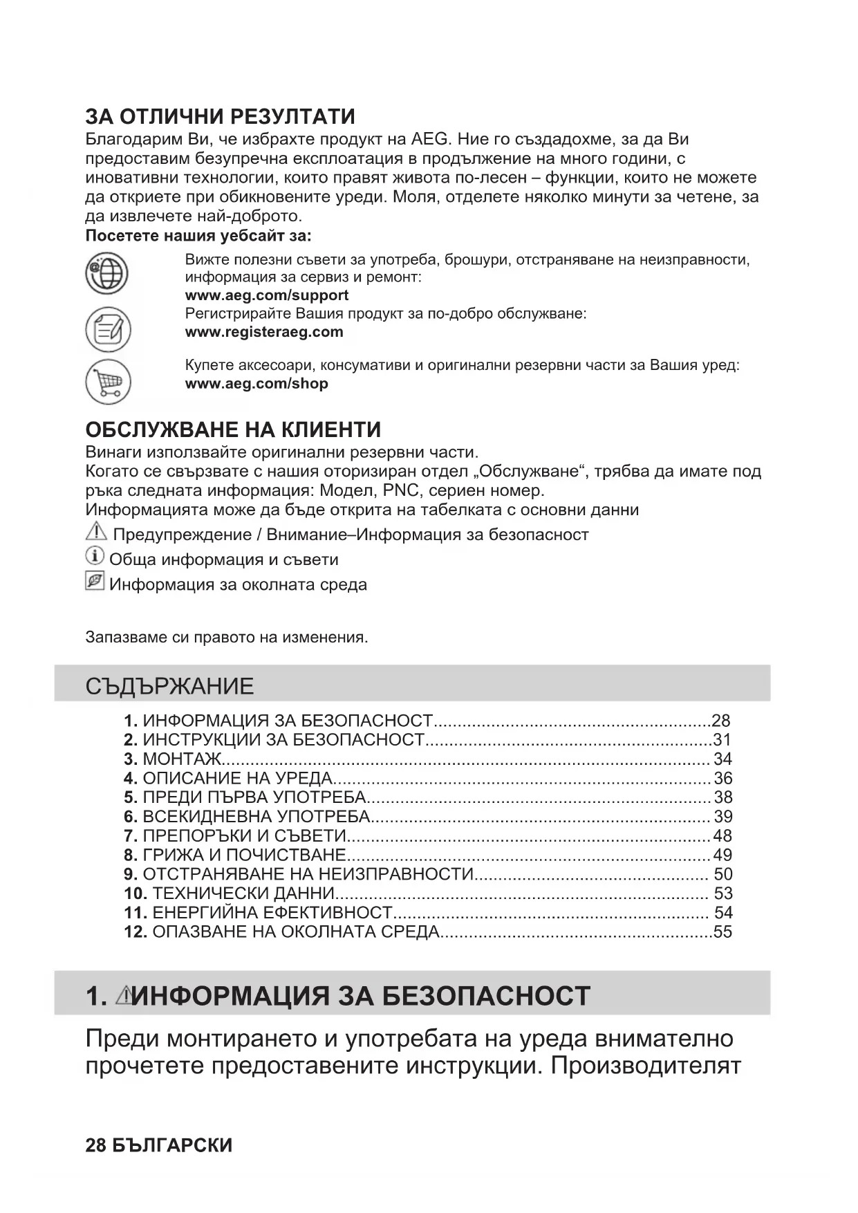 Ricikloni materialet me simbolin . Vendoseni ambalazhin te kontejnerët e riciklimit nëse ka. Ndihmoni në mbrojtjen e mjedisit dhe shëndetit të njerëzve dhe në riciklimin e mbetjeve të pajisjeve elektrike dhe elektronike. Mos hidhni pajisjet e shënuara me simbolin e mbeturinave shtëpiake. Ktheni produktin në pikën lokale të riciklimit ose kontaktoni me zyrën komunale. SHQIP 27ЗА ОТЛИЧНИ РЕЗУЛТАТИ Благодарим Ви, че избрахте продукт на AEG. Ние го създадохме, за да Випредоставим безупречна експлоатация в продължение на много години, синовативни технологии, които правят живота по-лесен – функции, които не можетеда откриете при обикновените уреди. Моля, отделете няколко минути за четене, зада извлечете най-доброто.Посетете нашия уебсайт за:Вижте полезни съвети за употреба, брошури, отстраняване на неизправности,информация за сервиз и ремонт:www.aeg.com/supportРегистрирайте Вашия продукт за по-добро обслужване:www.registeraeg.comКупете аксесоари, консумативи и оригинални резервни части за Вашия уред:www.aeg.com/shop ОБСЛУЖВАНЕ НА КЛИЕНТИ Винаги използвайте оригинални резервни части.Когато се свързвате с нашия оторизиран отдел „Обслужване“, трябва да имате подръка следната информация: Модел, PNC, сериен номер.Информацията може да бъде открита на табелката с основни данни Предупреждение / Внимание–Информация за безопасност Обща информация и съвети Информация за околната средаЗапазваме си правото на изменения. 1. ИНФОРМАЦИЯ ЗА БЕЗОПАСНОСТ..........................................................282. ИНСТРУКЦИИ ЗА БЕЗОПАСНОСТ............................................................31