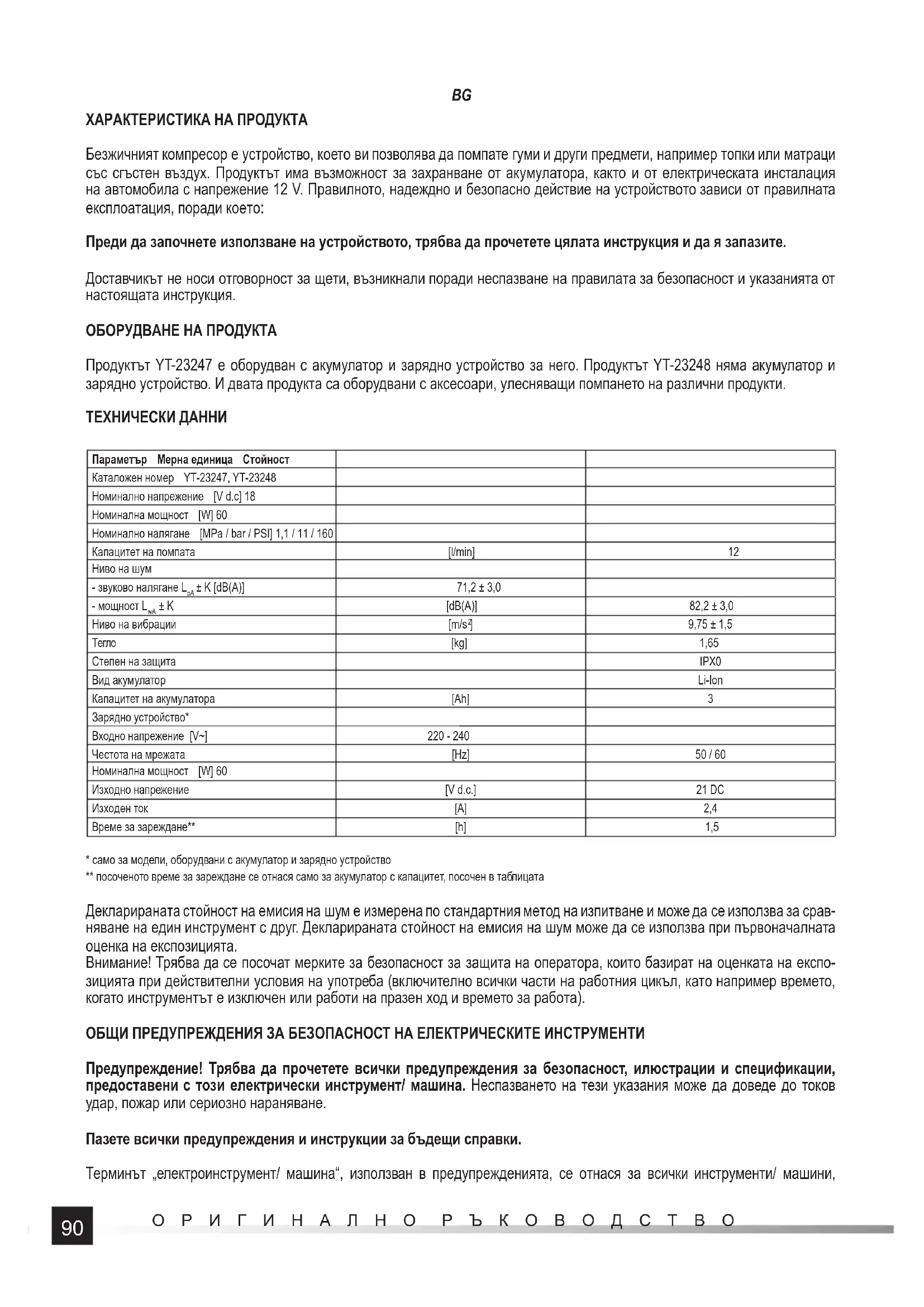 Преди да започнете използване на устройството, трябва да прочетете цялата инструкция и да я запазите. Доставчикът не носи отговорност за щети, възникнали поради неспазване на правилата за безопасност и указанията от настоящата инструкция. ОБОРУДВАНЕ НА ПРОДУКТА Продуктът YT-23247 е оборудван с акумулатор и зарядно устройство за него. Продуктът YT-23248 няма акумулатор и зарядно устройство. И двата продукта са оборудвани с аксесоари, улесняващи помпането на различни продукти. ТЕХНИЧЕСКИ ДАННИ Параметър Мерна единица Стойност Каталожен номер YT-23247, YT-23248 Номинално напрежение [V d.c] 18 Номинална мощност [W] 60 Номинално налягане [MPa / bar / PSI] 1,1 / 11 / 160 Капацитет на помпата [l/min] 12 Ниво на шум - звуково налягане L