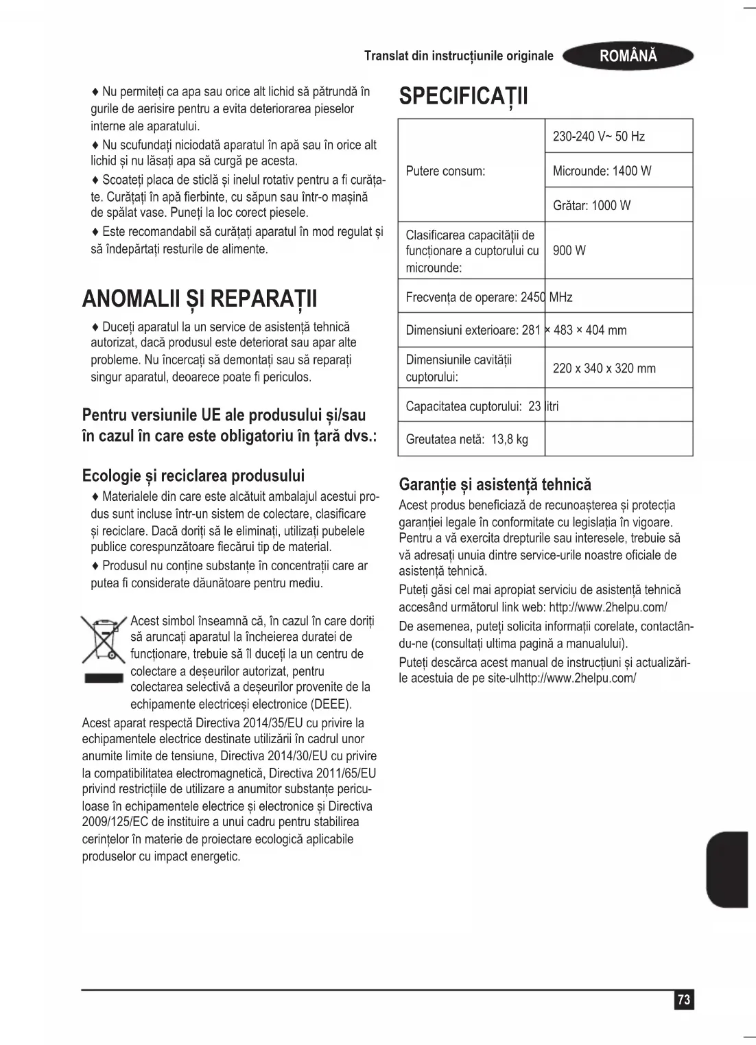 СПЕЦИФИКАЦИИ Потребена мощност: 230-240 V~ 50 Hz Микровълнова фурна: 1400 W Грил: 1000 W Изходна мощност на
