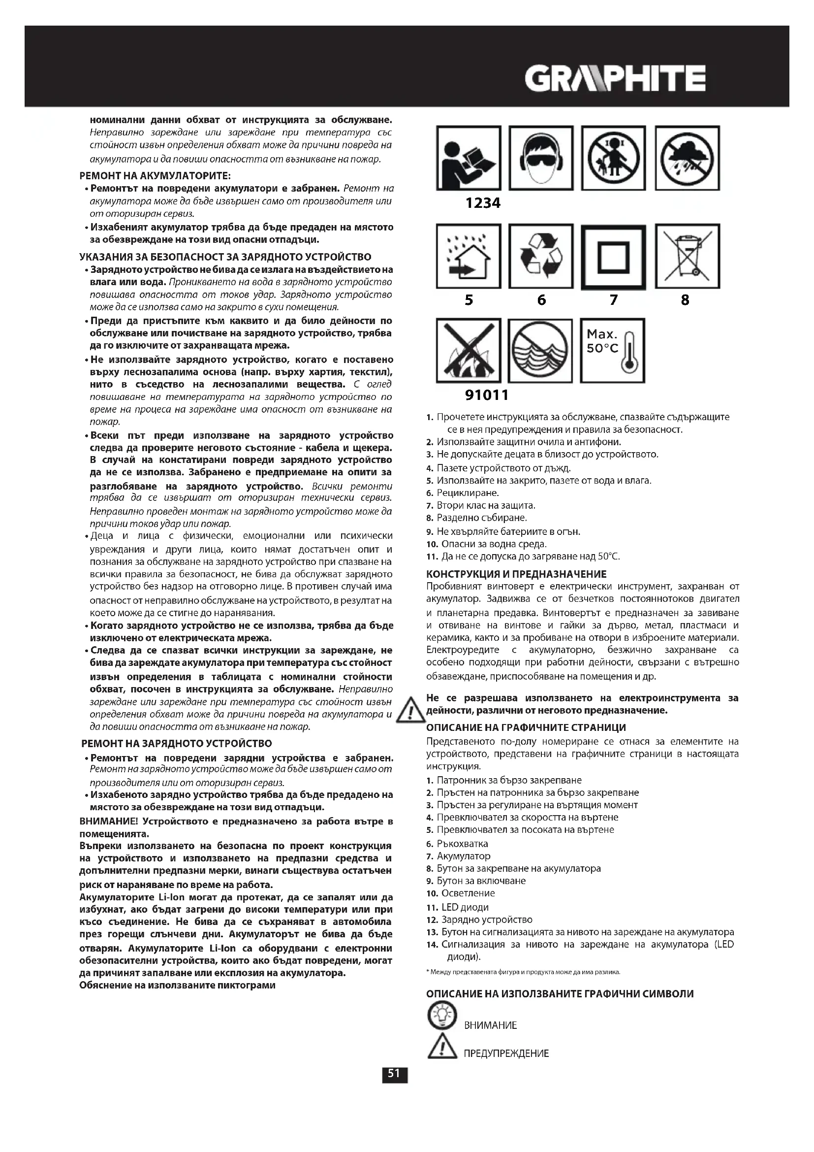 се в нея предупреждения и правила за безопасност. 2. Използвайте защитни очила и антифони.3. Не допускайте децата в близост до устройството. 4. Пазете устройството от дъжд.5. Използвайте на закрито, пазете от вода и влага.6. Рециклиране.7. Втори клас на защита.8. Разделно събиране.9. Не хвърляйте батериите в огън.10. Опасни за водна среда.11. Да не се допуска до загряване над 50°C. КОНСТРУКЦИЯ И ПРЕДНАЗНАЧЕНИЕ Пробивният винтоверт е електрически инструмент, захранван от акумулатор. Задвижва се от безчетков постояннотоков двигател и планетарна предавка. Винтовертът е предназначен за завиване и отвиване на винтове и гайки за дърво, метал, пластмаси и керамика, както и за пробиване на отвори в изброените материали. Електроуредите с акумулаторно, безжично захранване са особено подходящи при работни дейности, свързани с вътрешно обзавеждане, приспособяване на помещения и др. Не се разрешава използването на електроинструмента за дейности, различни от неговото предназначение. ОПИСАНИЕ НА ГРАФИЧНИТЕ СТРАНИЦИ Представеното по-долу номериране се отнася за елементите на устройството, представени на графичните страници в настоящата инструкция. 1. Патронник за бързо закрепване2. Пръстен на патронника за бързо закрепване3. Пръстен за регулиране на въртящия момент4. Превключвател за скоростта на въртене5. Превключвател за посоката на въртене6. Ръкохватка 7. Акумулатор8. Бутон за закрепване на акумулатора9. Бутон за включване10. Осветление11. LED диоди12. Зарядно устройство13. Бутон на сигнализацията за нивото на зареждане на акумулатора14. Сигнализация за нивото на зареждане на акумулатора (LED