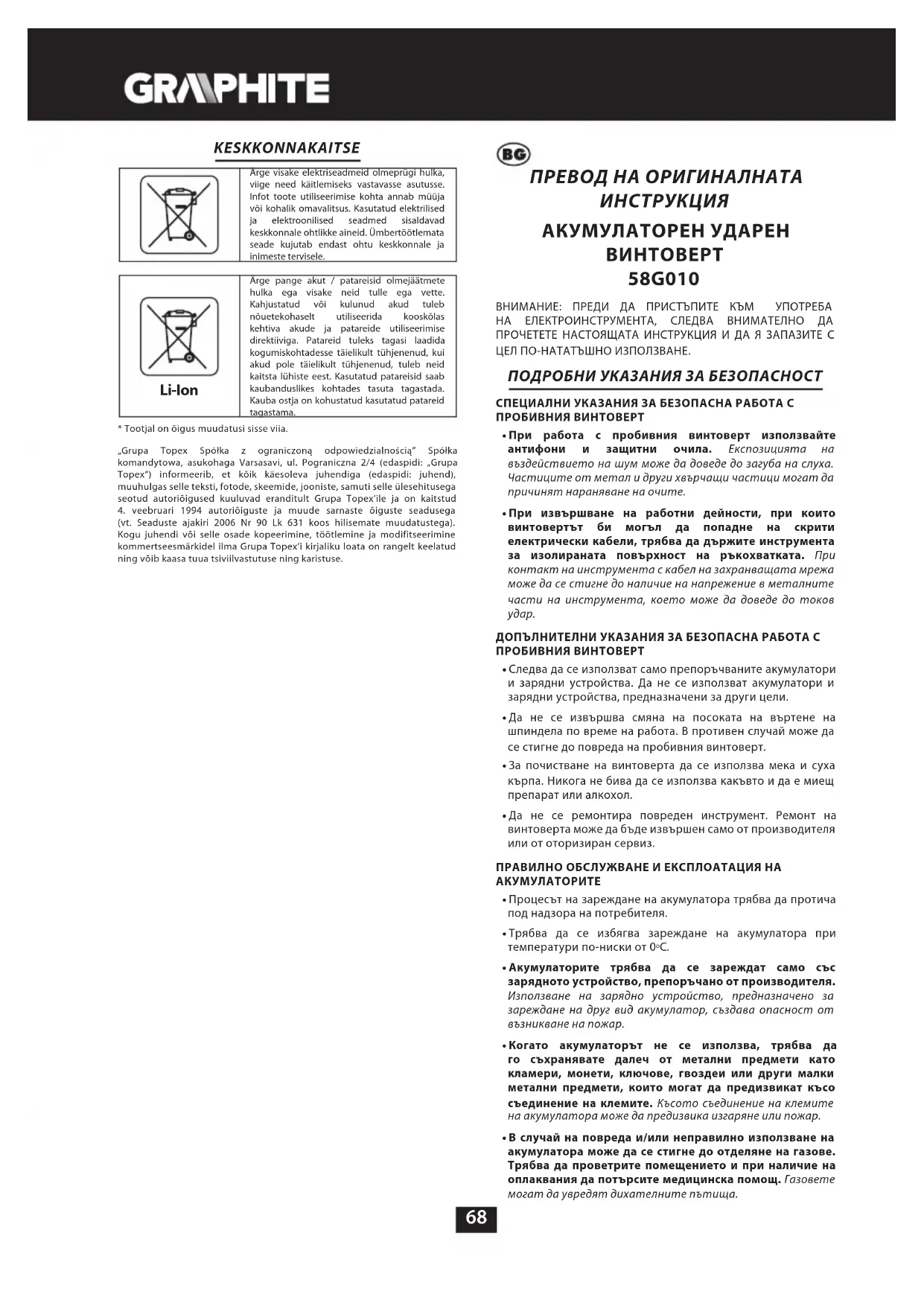 - Запазва се правото за извършване на промени. „Grupa Topex Spółka z ograniczoną odpowiedzialnością” Spółka komandytowa със седалище във Варшава, ул. Погранична 2/4 (наричана по-нататък : „Grupa Topex”) информира, че всякакви авторски права относно съдържанието на инструкция (наричана по-нататък : „Инструкция”), включващи между другото нейния текст, поместените фотографии, схеми, чертежи, а също и нейните композиции, принадлежат изключително на Grupa Topex и подлежат на правна защита съгласно закона от 4 февруари 1994 година относно авторското право и сродните му права (еднороден текст в Държавен вестник 2006 № 90 поз. 631 с по-късните изменения). Копирането, преработването, публикуването, модифицирането с комерческа цел на цялата инструкция, както и на отделните й елементи без съгласието на Grupa Topex изразено в писмена форма, е строго забранено и може и може да доведе до привличането към гражданска и наказателна отговорност. PRIJEVOD ORIGINALNIH UPUTA AKUMULATORSKA UDARNA