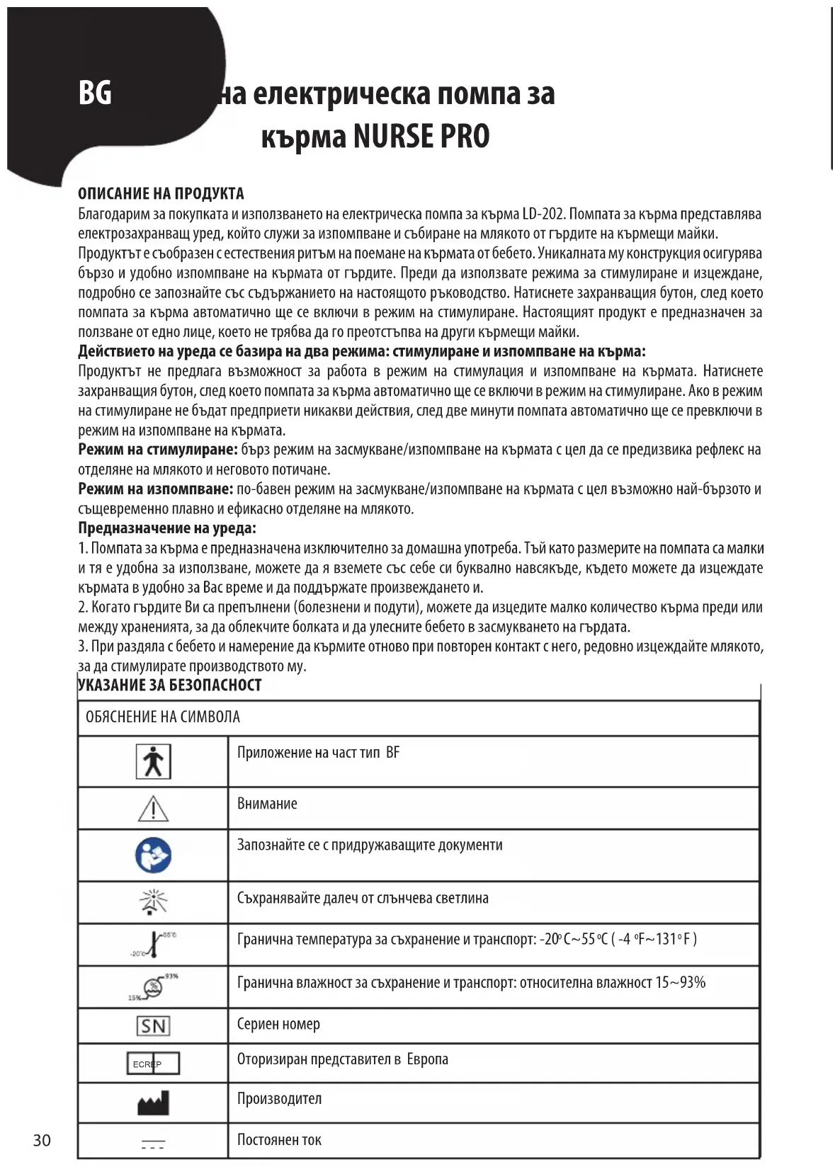 Dla nadajników o maksymalnej mocy wyjściowej nie wymienionej powyżej, zalecana odległość separacji d w metrach (m) może być oszacowana przy użyciu równania mającego zastosowanie do częstotliwości nadajnika, gdzie P stanowi maksymal- ną moc wyjściową nadajnika w watach (W) według producenta nadajnika. UWAGA1 Przy częstotliwości 80 MHz i 800 MHz, zastosowanie ma odległość separacji dla wyższego zakresu częstotliwości. UWAGA2 Wytyczne te mogą nie mieć zastosowania we wszystkich sytuacjach. Na propagację elektromagnetyczną wpływ ma absorpcja i odbicie od struktur, obiektów i ludzi Tabela 430 BG Двуфазна електрическа помпа за кърма NURSE PRO ОПИСАНИЕ НА ПРОДУКТА Благодарим за покупката и използването на електрическа помпа за кърма LD-202. Помпата за кърма представлява електрозахранващ уред, който служи за изпомпване и събиране на млякото от гърдите на кърмещи майки. Продуктът е съобразен с естествения ритъм на поемане на кърмата от бебето. Уникалната му конструкция осигурява бързо и удобно изпомпване на кърмата от гърдите. Преди да използвате режима за стимулиране и изцеждане, подробно се запознайте със съдържанието на настоящото ръководство. Натиснете захранващия бутон, след което помпата за кърма автоматично ще се включи в режим на стимулиране. Настоящият продукт е предназначен за ползване от едно лице, което не трябва да го преотстъпва на други кърмещи майки. Действието на уреда се базира на два режима: стимулиране и изпомпване на кърма: Продуктът не предлага възможност за работа в режим на стимулация и изпомпване на кърмата. Натиснете захранващия бутон, след което помпата за кърма автоматично ще се включи в режим на стимулиране. Ако в режим на стимулиране не бъдат предприети никакви действия, след две минути помпата автоматично ще се превключи в режим на изпомпване на кърмата. Режим на стимулиране: бърз режим на засмукване/изпомпване на кърмата с цел да се предизвика рефлекс на отделяне на млякото и неговото потичане. Режим на изпомпване: по-бавен режим на засмукване/изпомпване на кърмата с цел възможно най-бързото и същевременно плавно и ефикасно отделяне на млякото. Предназначение на уреда: