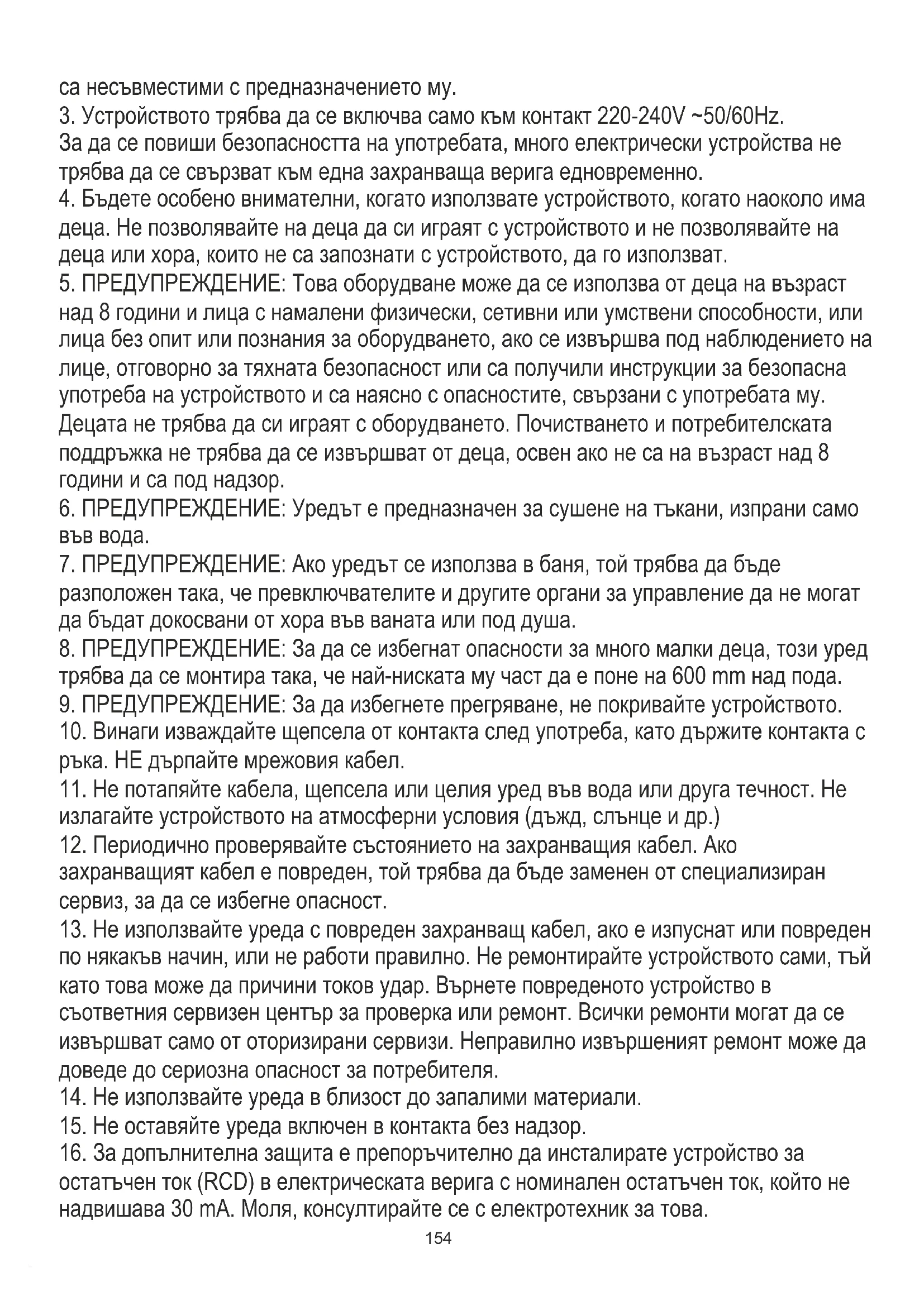 над 8 години и лица с намалени физически, сетивни или умствени способности, или лица без опит или познания за оборудването, ако се извършва под наблюдението на лице, отговорно за тяхната безопасност или са получили инструкции за безопасна употреба на устройството и са наясно с опасностите, свързани с употребата му. Децата не трябва да си играят с оборудването. Почистването и потребителската поддръжка не трябва да се извършват от деца, освен ако не са на възраст над 8 години и са под надзор.