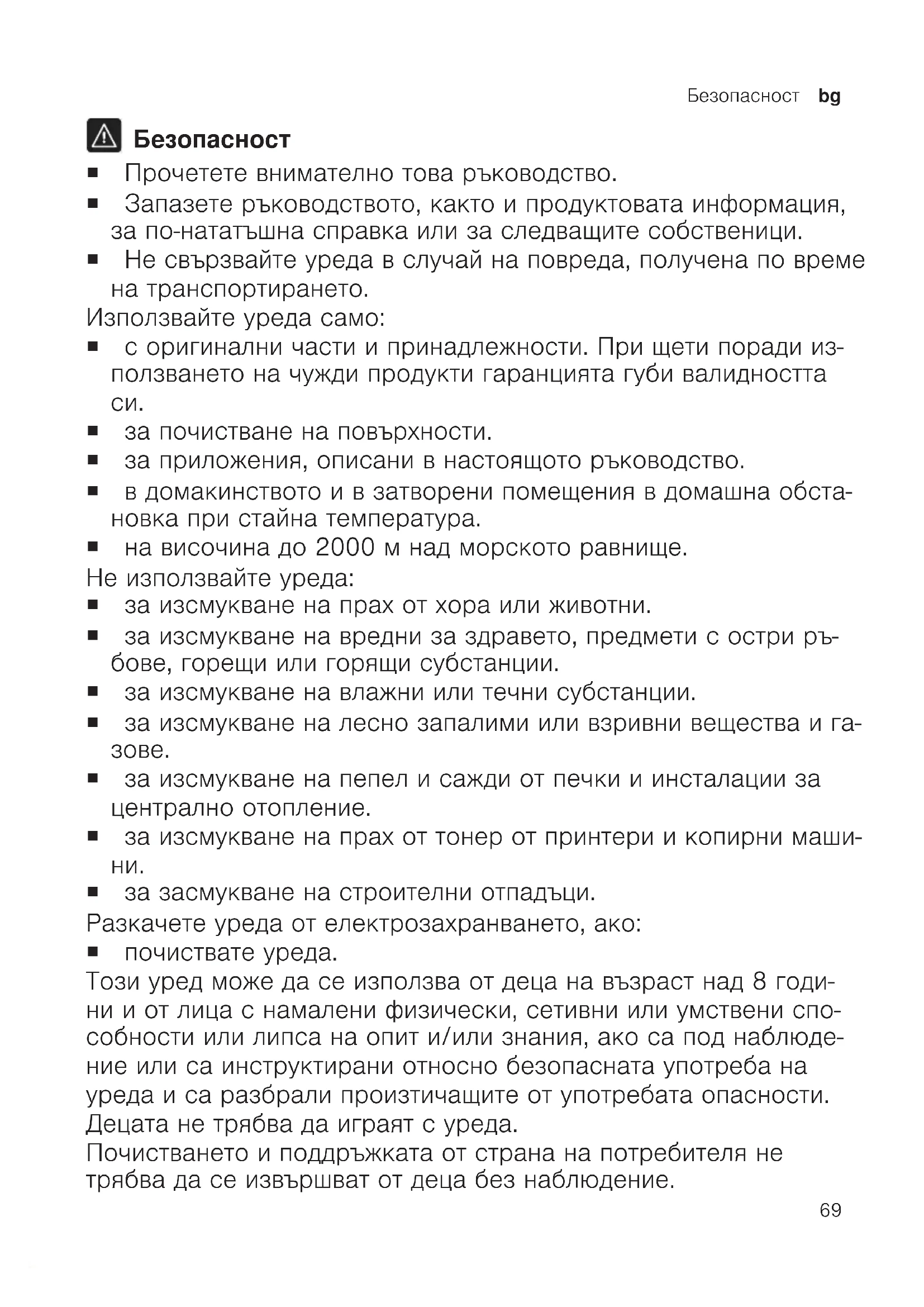 ¡ за засмукване на строителни отпадъци. Разкачете уреда от електрозахранването, ако: ¡ почиствате уреда. Този уред може да се използва от деца на възраст над 8 годи- ни и от лица с намалени физически, сетивни или умствени спо- собности или липса на опит и/или знания, ако са под наблюде- ние или са инструктирани относно безопасната употреба на уреда и са разбрали произтичащите от употребата опасности. Децата не трябва да играят с уреда. Почистването и поддръжката от страна на потребителя не трябва да се извършват от деца без наблюдение.bg Безопасност