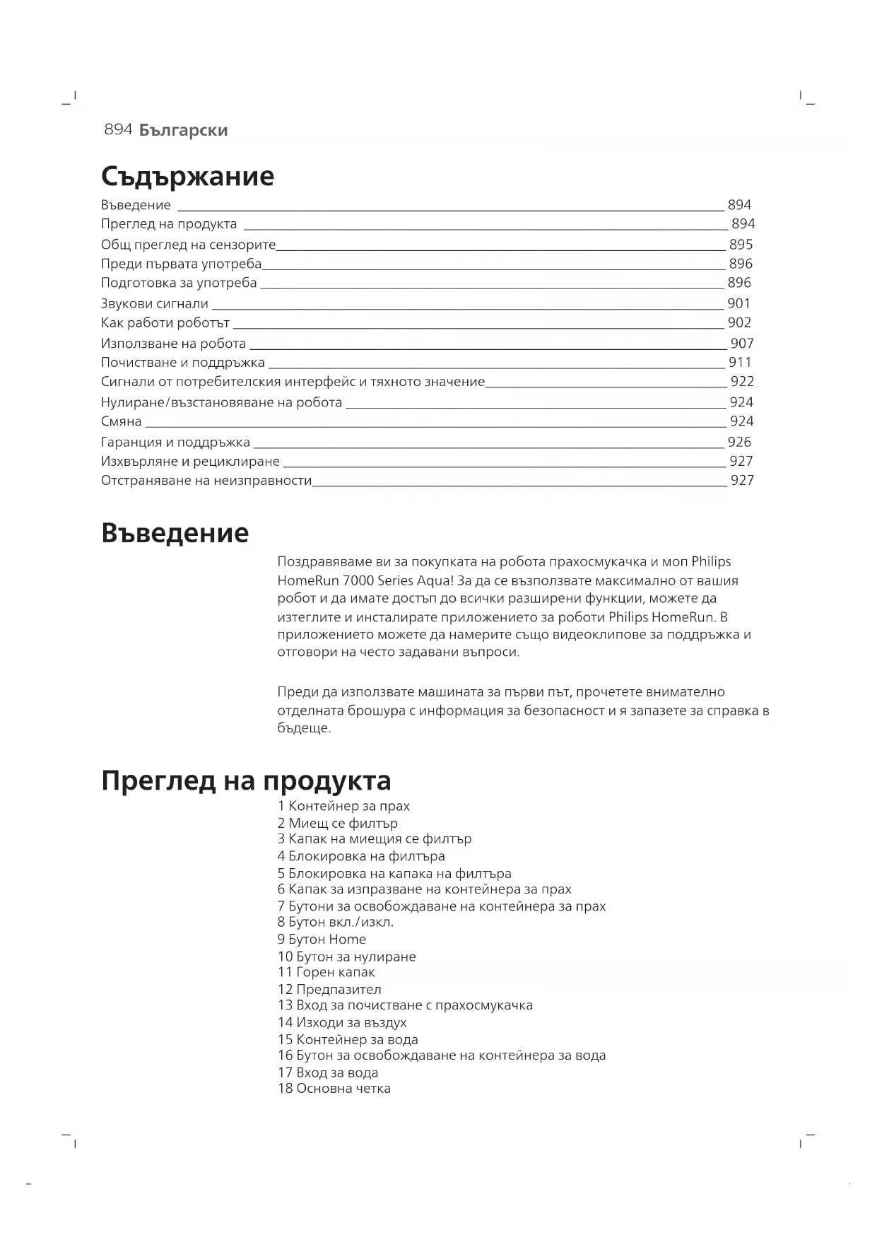 Поздравяваме ви за покупката на робота прахосмукачка и моп Philips HomeRun 7000 Series Aqua! За да се възползвате максимално от вашия робот и да имате достъп до всички разширени функции, можете да изтеглите и инсталирате приложението за роботи Philips HomeRun. В приложението можете да намерите също видеоклипове за поддръжка и отговори на често задавани въпроси. Преди да използвате машината за първи път, прочетете внимателно отделната брошура с информация за безопасност и я запазете за справка в
