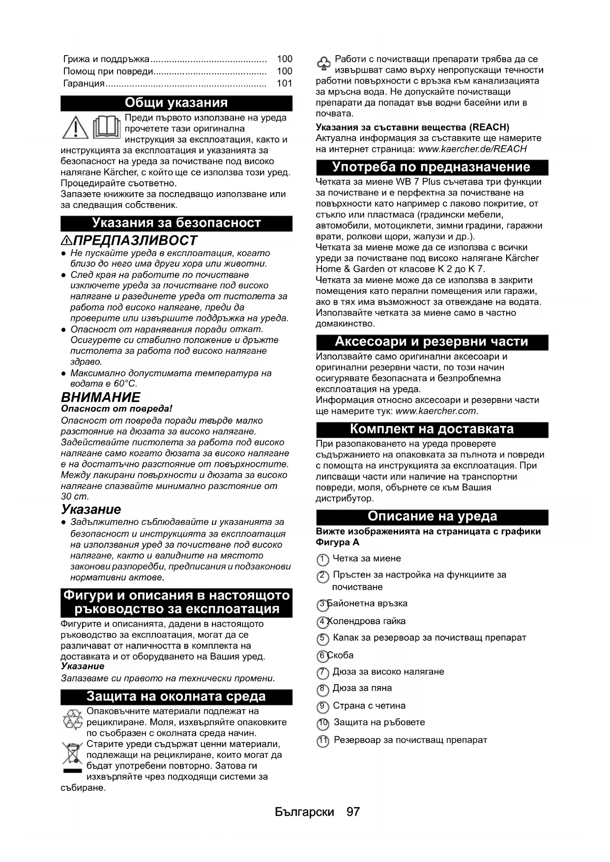 3 Байонетна връзка 4 Холендрова гайка 5 Капак за резервоар за почистващ препарат 6 Скоба 7 Дюза за високо налягане 8 Дюза за пяна 9 Страна с четина 10 Защита на ръбовете 11 Резервоар за почистващ препарат Грижа и поддръжка............................................ 100 Помощ при повреди........................................... 100 Гаранция............................................................. 10198 Български Пускане в експлоатация