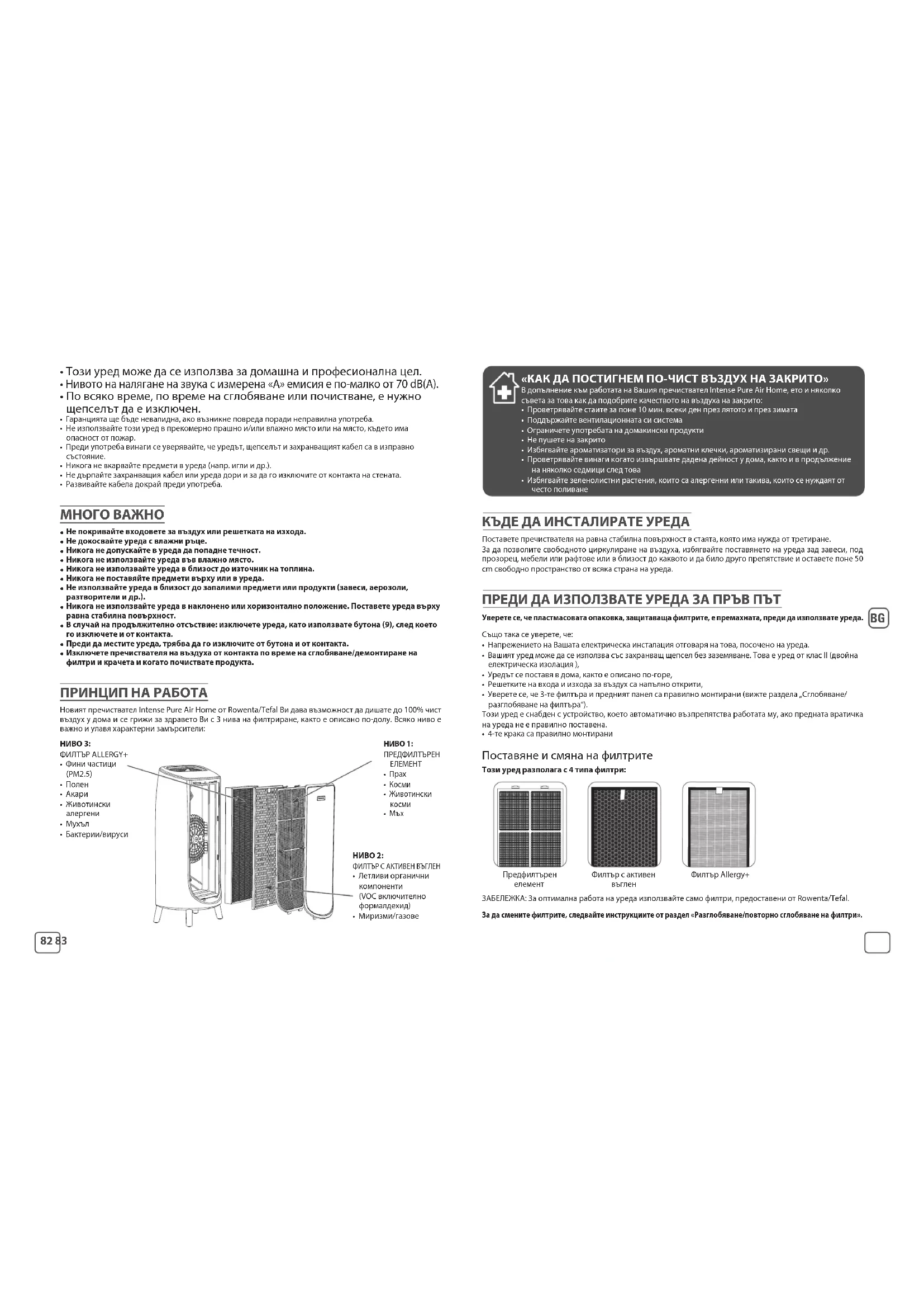 Изключете пречиствателя на въздуха от контакта по време на сглобяване/демонтиране на филтри и крачета и когато почиствате продукта. ПРИНЦИП НА РАБОТА Новият пречиствател Intense Pure Air Home от Rowenta/Tefal Ви дава възможност да дишате до 100% чист въздух у дома и се грижи за здравето Ви с 3 нива на филтриране, както е описано по-долу. Всяко ниво е важно и улавя характерни замърсители: НИВО 3: ФИЛТЪР ALLERGY+