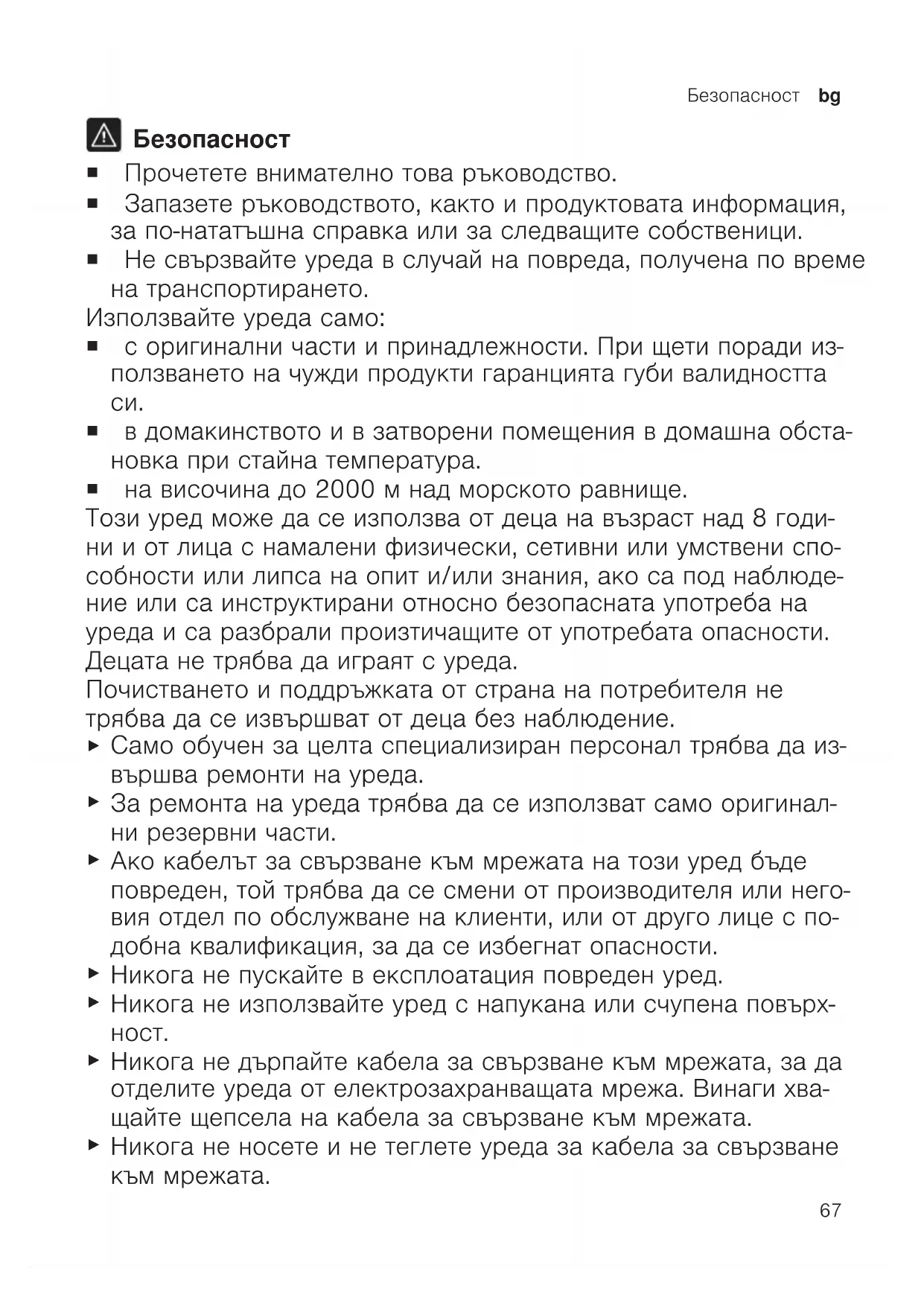 Безопасност ¡ Прочетете внимателно това ръководство. ¡ Запазете ръководството, както и продуктовата информация, за по-нататъшна справка или за следващите собственици. ¡ Не свързвайте уреда в случай на повреда, получена по време на транспортирането. Използвайте уреда само: ¡ с оригинални части и принадлежности. При щети поради из- ползването на чужди продукти гаранцията губи валидността
