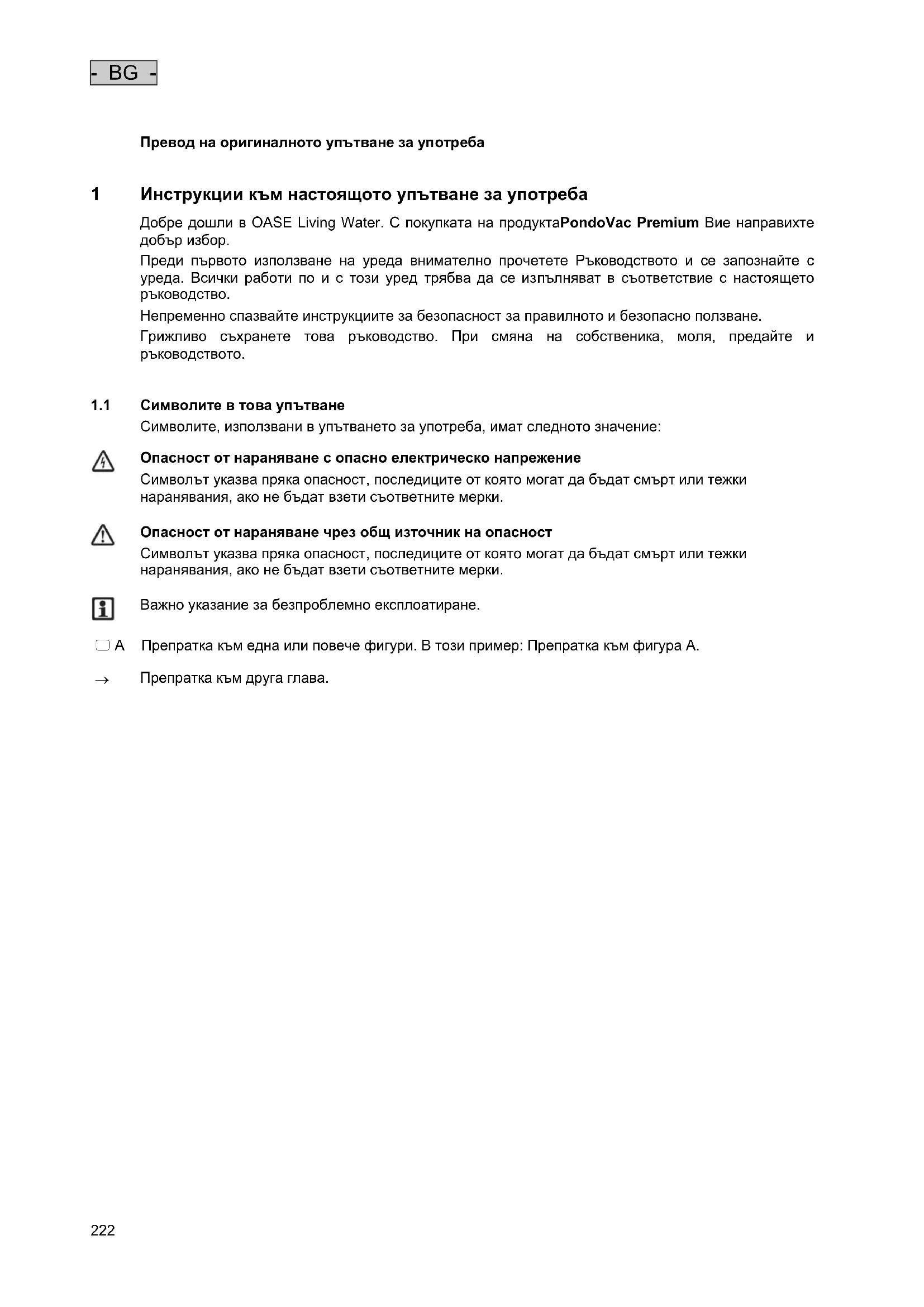 1 Инструкции към настоящото упътване за употреба Добре дошли в OASE Living Water. С покупката на продуктаPondoVac Premium Вие направихте добър избор. Преди първото използване на уреда внимателно прочетете Ръководството и се запознайте с уреда. Всички работи по и с този уред трябва да се изпълняват в съответствие с настоящето ръководство. Непременно спазвайте инструкциите за безопасност за правилното и безопасно ползване. Грижливо съхранете това ръководство. При смяна на собственика, моля, предайте и ръководството.