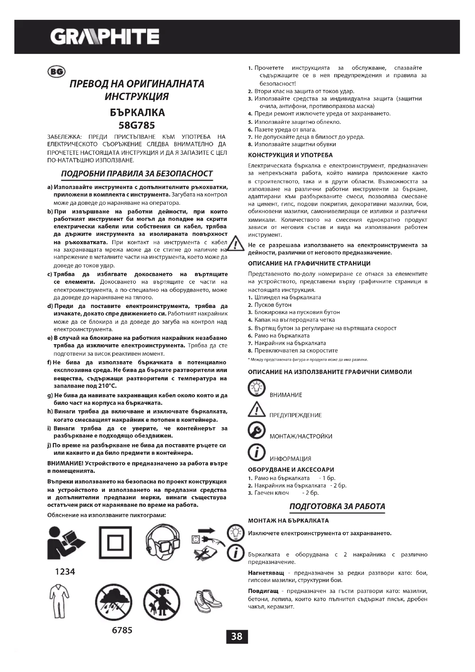 58G785 ЗАБЕЛЕЖКА: ПРЕДИ ПРИСТЪПВАНЕ КЪМ УПОТРЕБА НА ЕЛЕКТРИЧЕСКОТО СЪОРЪЖЕНИЕ СЛЕДВА ВНИМАТЕЛНО ДА ПРОЧЕТЕТЕ НАСТОЯЩАТА ИНСТРУКЦИЯ И ДА Я ЗАПАЗИТЕ С ЦЕЛ ПО-НАТАТЪШНО ИЗПОЛЗВАНЕ. ПОДРОБНИ ПРАВИЛА ЗА БЕЗОПАСНОСТ a) Използвайте инструмента с допълнителните ръкохватки, приложени в комплекта с инструмента. Загубата на контрол може да доведе до нараняване на оператора. b) При извършване на работни дейности, при които работният инструмент би могъл да попадне на скрити електрически кабели или собствения си кабел, трябва да държите инструмента за изолираната повърхност на ръкохватката. При контакт на инструмента с кабел на захранващата мрежа може да се стигне до наличие на напрежение в металните части на инструмента, което може да доведе до токов удар. c) Трябва да избягвате докосването на въртящите се елементи. Докосването на въртящите се части на електроинструмента, а по-специално на оборудването, може да доведе до нараняване на тялото. d) Преди да поставите електроинструмента, трябва да изчакате, докато спре движението си. Работният накрайник може да се блокира и да доведе до загуба на контрол над електроинструмента. e) В случай на блокиране на работния накрайник незабавно трябва да изключите електроинструмента. Трябва да сте подготвени за висок реактивен момент. f) Не бива да използвате бъркачката в потенциално експлозивна среда. Не бива да бъркате разтворители или вещества, съдържащи разтворители с температура на запалване под 210°C. g) Не бива да навивате захранващия кабел около която и да било част на корпуса на бъркачката. h) Винаги трябва да включване и изключвате бъркалката, когато смесващият накрайник е потопен в контейнера.