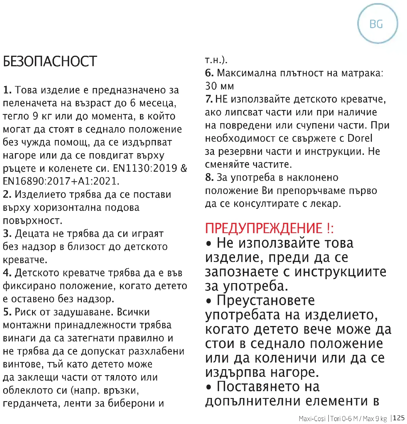 Maxi-Cosi от нашия сервиз. Ако предоставите валиден иск по тази гаранция, е възможно да поискаме от вас да върнете продукта на упълномощения от нас разпространител или търговец, или да ни го изпратите съгласно нашите инструкции. Ние поемаме разходите за изпращането и връщането на пратката, само в случай че са спазени всички инструкции. Повреди и/или дефекти, които не се покриват нито от нашата гаранция, нито от законните права на потребителя и/или повреди и/ или дефекти по отношение на продуктите, които не се покриват от нашата гаранция, могат да бъдат поправени на разумна цена. Права на потребителя: Потребителят има законни права съгласно приложимото законодателство в защита на потребителите, което се различава в зависимост от държавата. Правата на потребителя в съответствие с приложимото национално законодателство не се засягат от тази гаранция. Тази гаранция е предоставена от Dorel Netherlands. Ние сме регистрирани в Нидерландия под фирмен номер 17060920. Търговският ни адрес е Korendijk 5, 5704 RD Helmond, Нидерландия, а пощенският ни адрес е P.O. Box 6071, 5700 ET Helmond, Нидерландия. Имената и адресите на други дъщерни фирми на групата Dorel можете да намерите на последната страница на това ръководство и на уебстраницата на съответната марка. (1) Продукти, закупени от търговци или разпространители, които са отстранили или променили етикети или идентификационни номера, се считат за неупълномощени. Продукти, закупени от неупълномощени разпространители, също се считат за неодобрени. За такива продукти гаранцията не важи, тъй като автентичността им не може да бъде доказана. BGMaxi-Cosi