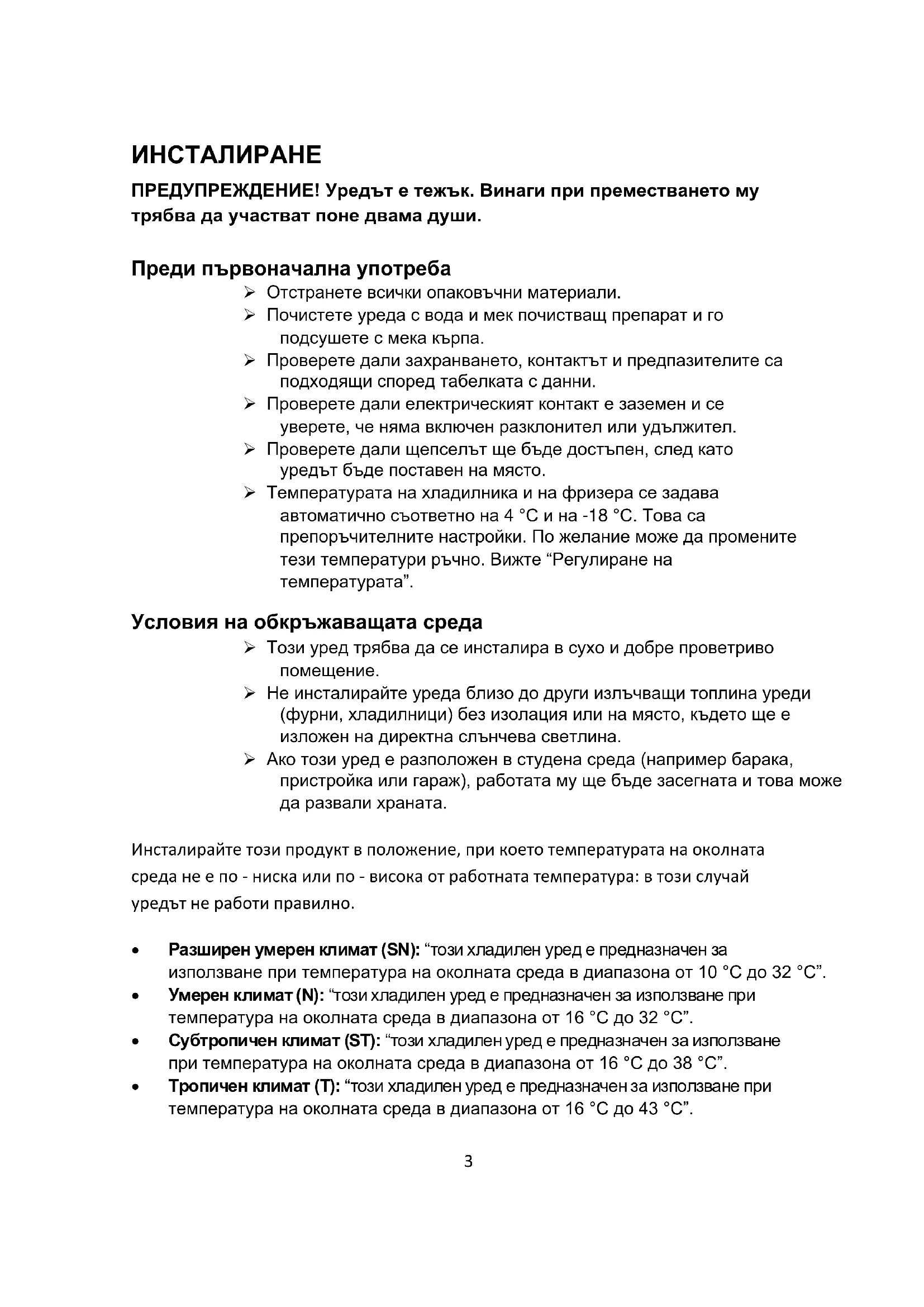ИНСТАЛИРАНЕ ПРЕДУПРЕЖДЕНИЕ! Уредът е тежък. Винаги при преместването му трябва да участват поне двама души. Преди първоначална употреба ➢ Отстранете всички опаковъчни материали. ➢ Почистете уреда с вода и мек почистващ препарат и го подсушете с мека кърпа. ➢ Проверете дали захранването, контактът и предпазителите са подходящи според табелката с данни. ➢ Проверете дали електрическият контакт е заземен и се уверете, че няма включен разклонител или удължител. ➢ Проверете дали щепселът ще бъде достъпен, след като уредът бъде поставен на място. ➢ Температурата на хладилника и на фризера се задава автоматично съответно на 4 °C и на -18 °C. Това са препоръчителните настройки. По желание може да промените тези температури ръчно. Вижте “Регулиране на температурата”. Условия на обкръжаващата среда ➢ Този уред трябва да се инсталира в сухо и добре проветриво