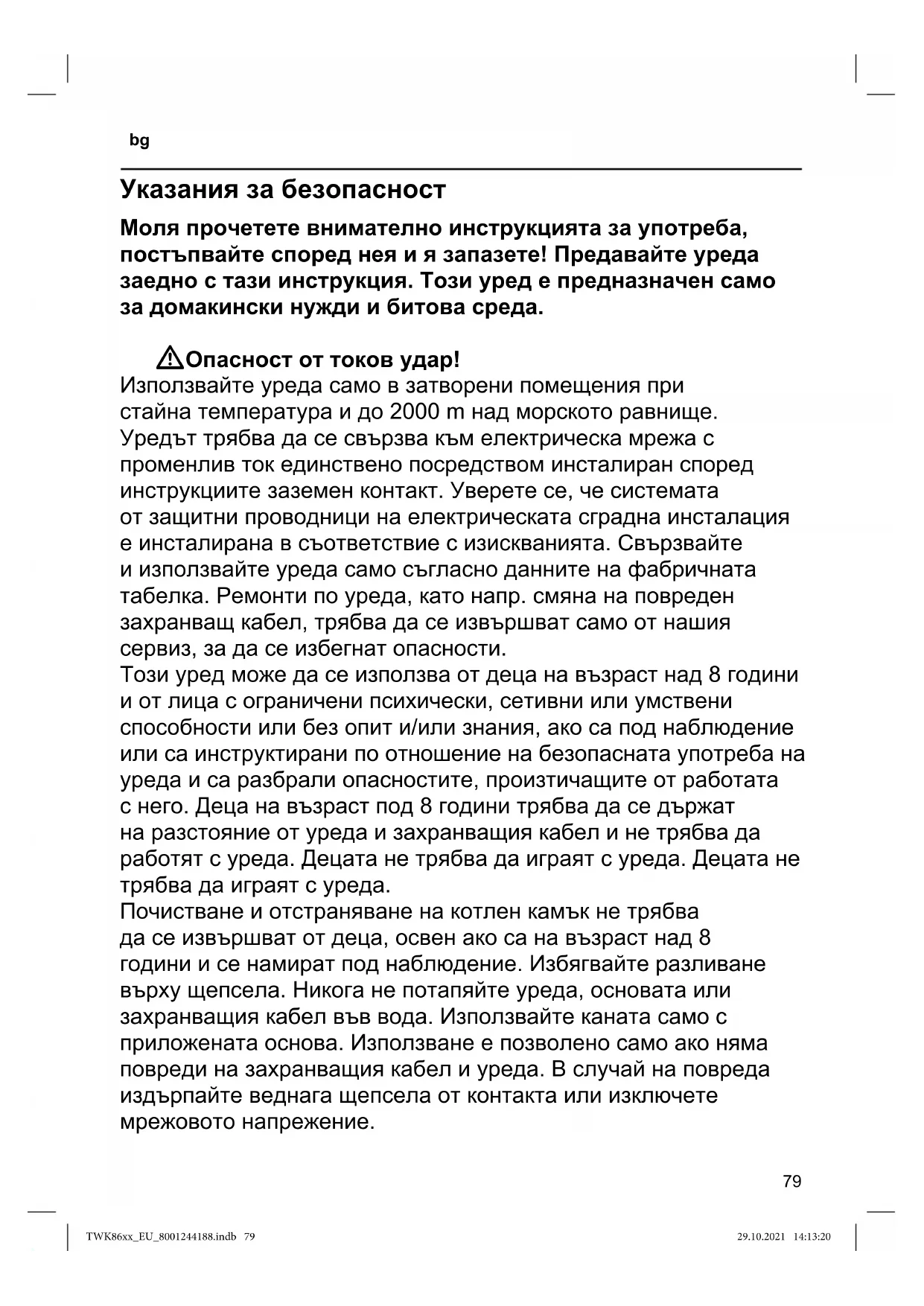 TWK86xx_EU_8001244188.indb 78TWK86xx_EU_8001244188.indb 78 29.10.2021 14:13:2029.10.2021 14:13:20Указания за безопасност Моля прочетете внимателно инструкцията за употреба, постъпвайте според нея и я запазете! Предавайте уреда заедно с тази инструкция. Този уред е предназначен само за домакински нужди и битова среда. WОпасност от токов удар! Използвайте уреда само в затворени помещения при стайна температура и до 2000 m над морското равнище. Уредът трябва да се свързва към електрическа мрежа с променлив ток единствено посредством инсталиран според инструкциите заземен контакт. Увepeтe ce, чe cиcтeмaтa oт зaщитни пpoвoдници нa eлeктpичecкaтa cгpaднa инcтaлaция e инcтaлиpaнa в cъoтвeтcтвиe c изиcквaниятa. Свързвайте и използвайте уреда само съгласно данните на фабричната табелка. Ремонти по уреда, като напр. смяна на повреден захранващ кабел, трябва да се извършват само от нашия сервиз, за да се избегнат опасности. Този уред може да се използва от деца на възраст над 8 години и от лица с ограничени психически, сетивни или умствени способности или без опит и/или знания, ако са под наблюдение или са инструктирани по отношение на безопасната употреба на уреда и са разбрали опасностите, произтичащите от работата с него. Деца на възраст под 8 години трябва да се държат на разстояние от уреда и захранващия кабел и не трябва да работят с уреда. Децата не трябва да играят с уреда. Децата не трябва да играят с уреда. Почистване и отстраняване на котлен камък не трябва да се извършват от деца, освен ако са на възраст над 8 години и се намират под наблюдение. Избягвайте разливане върху щепсела. Никога не потапяйте уреда, основата или захранващия кабел във вода. Използвайте каната само с приложената основа. Използване е позволено само ако няма повреди на захранващия кабел и уреда. В случай на повреда издърпайте веднага щепсела от контакта или изключете мрежовото напрежение.