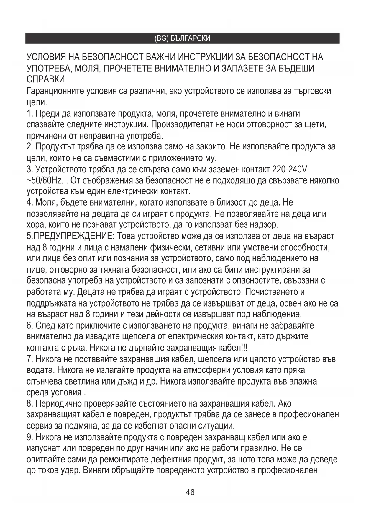 захранващият кабел е повреден, продуктът трябва да се занесе в професионален сервиз за подмяна, за да се избегнат опасни ситуации. УСЛОВИЯ НА БЕЗОПАСНОСТ ВАЖНИ ИНСТРУКЦИИ ЗА БЕЗОПАСНОСТ НА УПОТРЕБА, МОЛЯ, ПРОЧЕТЕТЕ ВНИМАТЕЛНО И ЗАПАЗЕТЕ ЗА БЪДЕЩИ