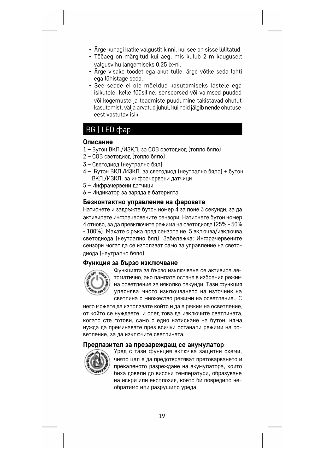 1 – Бутон ВКЛ./ИЗКЛ. за COB светодиод (топло бяло) 2 – COB светодиод (топло бяло) 3 – Светодиод (неутрално бял) 4 – Бутон ВКЛ./ИЗКЛ. за светодиод (неутрално бяло) + бутон ВКЛ./ИЗКЛ. за инфрачервени датчици 5 – Инфрачервени датчици 6 – Индикатор за заряда в батерията Безконтактно управление на фаровете Натиснете и задръжте бутон номер 4 за поне 3 секунди, за да активирате инфрачервените сензори. Натиснете бутон номер 4 отново, за да превключите режима на светодиода (25% - 50% - 100%). Махате с ръка пред сензора не. 5 включва/изключва светодиода (неутрално бял). Забележка: Инфрачервените сензори могат да се използват само за управление на свето- диода (неутрално бяло). Функция за бързо изключване Функцията за бързо изключване се активира ав- томатично, ако лампата остане в избрания режим на осветление за няколко секунди. Тази функция улеснява много изключването на източник на светлина с множество режими на осветление.. С него можете да използвате който и да е режим на осветление, от който се нуждаете, и след това да изключите светлината, когато сте готови, само с едно натискане на бутон, няма нужда да преминавате през всички останали режими на ос- ветление, за да изключите светлината. Предпазител за презареждащ се акумулатор Уред с тази функция включва защитни схеми, чиято цел е да предотвратяват претоварването и прекаленото разреждане на акумулатора, които биха довели до високи температури, образуване на искри или експлозия, което би повредило не- обратимо или разрушило уреда.20 Зареждане на акумулаторната батерия If акумулаторът се зарежда, един от четирите светодиода отстрани на продукта ще мига. След като акумулаторът се зареди и четирите светодиода ще светнат едновременно. Инструкции за безопасност и предупреждения Преди да използвате устройството, прочете ръководство- то за потребителя. Спазвайте инструкциите за безопасност, дадени в насто- ящото ръководство.