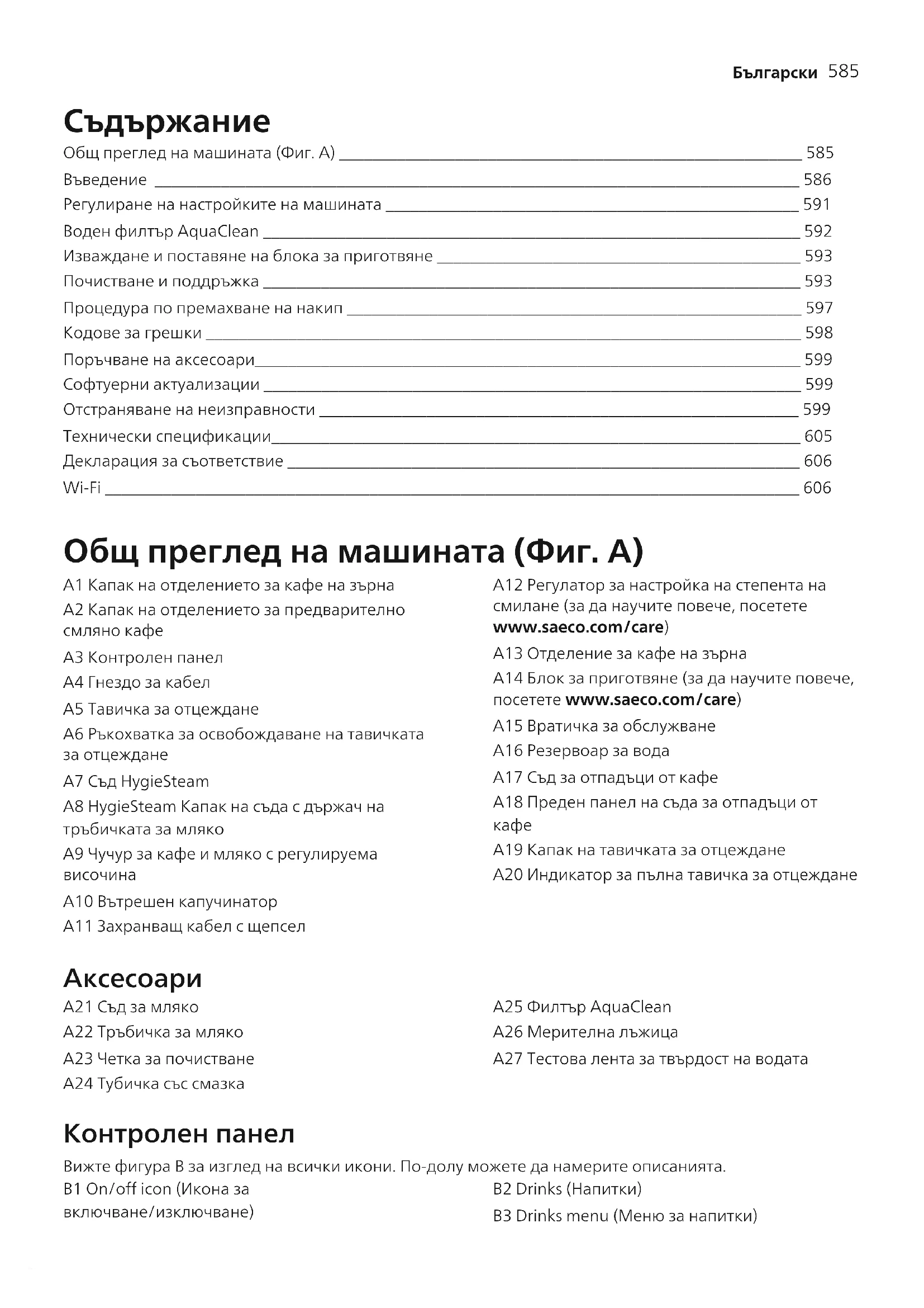 Общ преглед на машината (Фиг. А) ________________________________________________________ 585 Въведение ______________________________________________________________________________ 586 Регулиране на настройките на машината __________________________________________________ 591 Воден филтър AquaClean _________________________________________________________________ 592 Изваждане и поставяне на блока за приготвяне ____________________________________________ 593 Почистване и поддръжка _________________________________________________________________ 593 Процедура по премахване на накип _______________________________________________________ 597 Кодове за грешки ________________________________________________________________________ 598 Поръчване на аксесоари__________________________________________________________________ 599 Софтуерни актуализации _________________________________________________________________ 599 Отстраняване на неизправности __________________________________________________________ 599 Технически спецификации________________________________________________________________ 605 Декларация за съответствие ______________________________________________________________ 606 Wi-Fi ____________________________________________________________________________________ 606 Общ преглед на машината (Фиг. А) A1 Капак на отделението за кафе на зърна A2 Капак на отделението за предварително смляно кафе A3 Контролен панел A4 Гнездо за кабел A5 Тавичка за отцеждане A6 Ръкохватка за освобождаване на тавичката за отцеждане A7 Съд HygieSteam A8 HygieSteam Капак на съда с държач на тръбичката за мляко A9 Чучур за кафе и мляко с регулируема