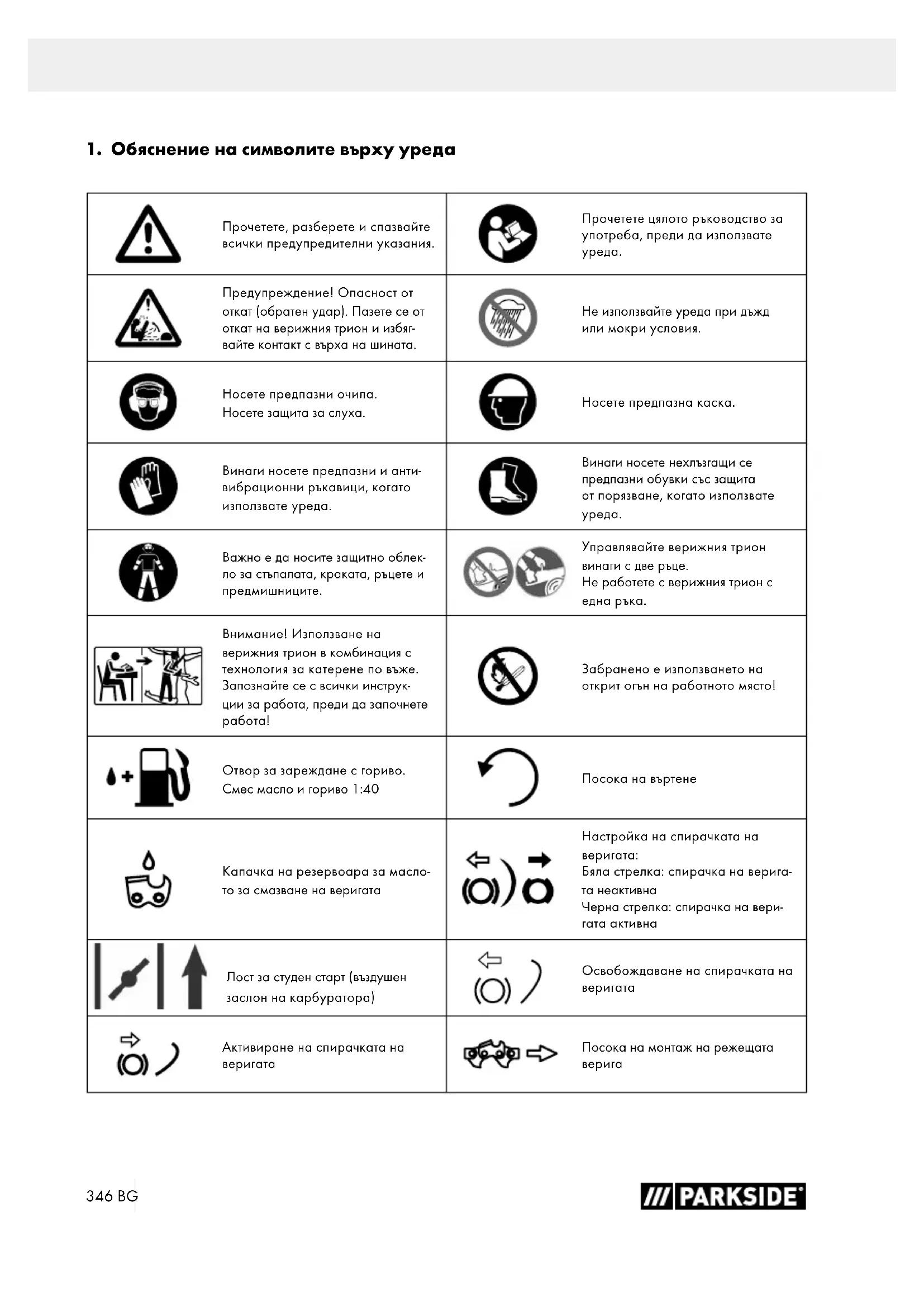 ПРЕДУПРЕЖДЕНИЕ: Преди първи пуск в експлоатация прочетете внимателно настоящото ръководство за експлоатация и задължително спазвайте правилата за техника на безопасност! Този трион за подрязване на дър- вета може да се обслужва само от „оператори на триони за подрязване на дървета, обучени до- пълнително за работи в подемни клетки и на стълби с кош, респ. с технология за катерене по въже“! Съхранявайте грижливо ръководството за експлоатация!