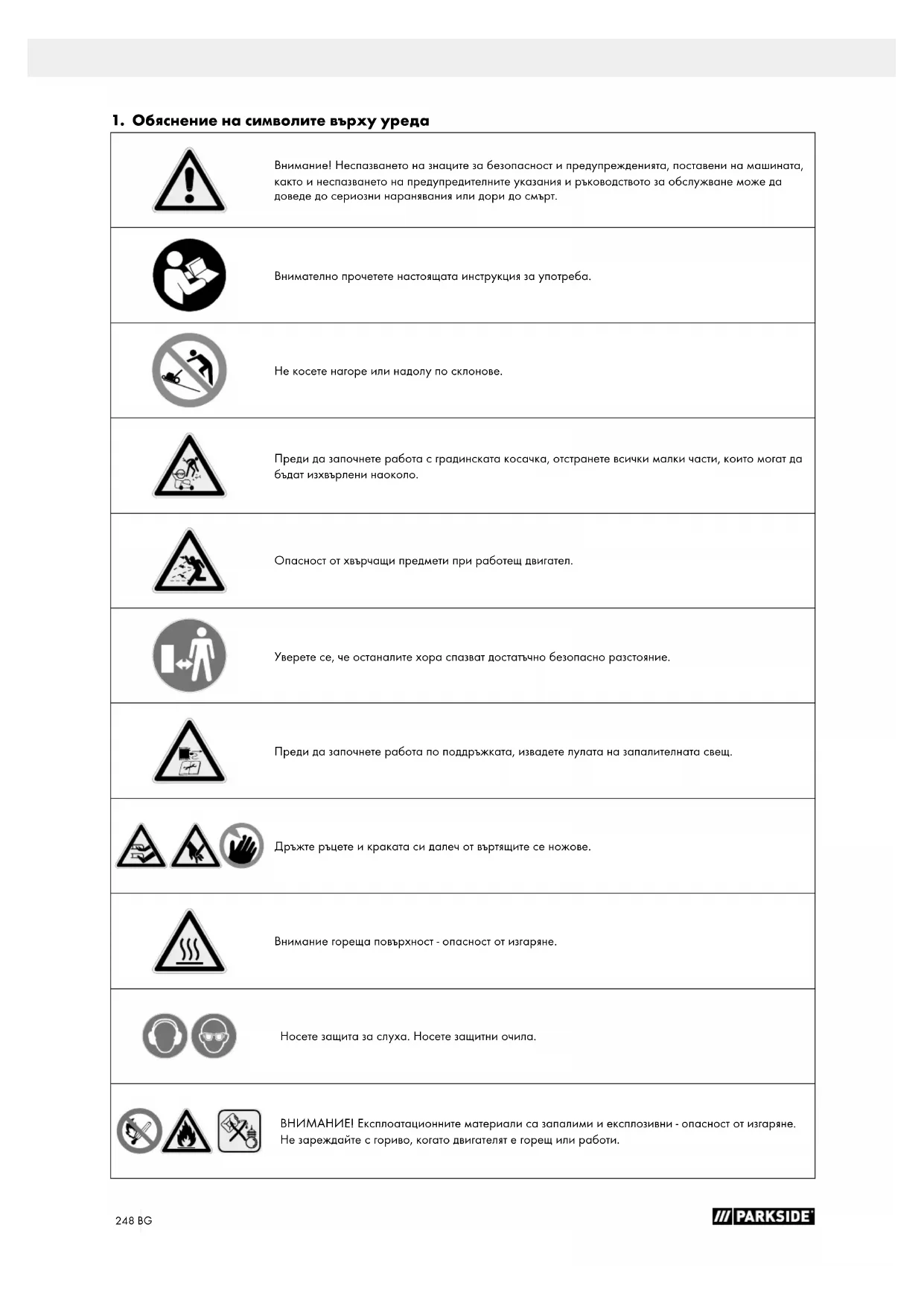 Внимание! Неспазването на знаците за безопасност и предупрежденията, поставени на машината, както и неспазването на предупредителните указания и ръководството за обслужване може да доведе до сериозни наранявания или дори до смърт. Внимателно прочетете настоящата инструкция за употреба. Не косете нагоре или надолу по склонове. Преди да започнете работа с градинската косачка, отстранете всички малки части, които могат да бъдат изхвърлени наоколо. Опасност от хвърчащи предмети при работещ двигател. Уверете се, че останалите хора спазват достатъчно безопасно разстояние. Преди да започнете работа по поддръжката, извадете лулата на запалителната свещ. Дръжте ръцете и краката си далеч от въртящите се ножове. Внимание гореща повърхност - опасност от изгаряне. Носете защита за слуха. Носете защитни очила. ВНИМАНИЕ! Експлоатационните материали са запалими и експлозивни - опасност от изгаряне. Не зареждайте с гориво, когато двигателят е горещ или работи.249BG Вместимост на резервоара Моторно масло