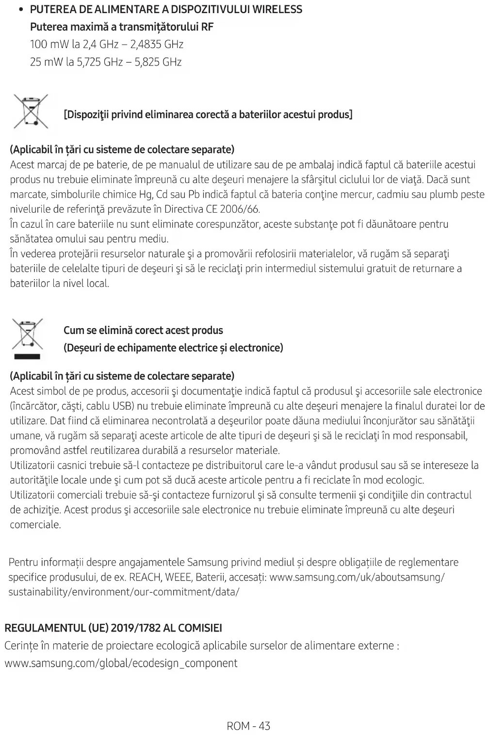 - ИЗХОДНА МОЩНОСТ НА БЕЗЖИЧНОТО УСТРОЙСТВО Макс. мощност на предавателя при RF връзка 100mW при 2,4GHz – 2,4835GHz 25mW при 5,725GHz – 5,825GHz [Правилно изхвърляне на батериите в този продукт] (Налично в страни със системи за разделно сметосъбиране) Това обозначение върху батерията, ръководството или опаковката, показва, че батериите в този продукт не бива да се изхвърлят с другите битови отпадъци в края на техния полезен живот. Където са маркирани, химическите символи Hg, Cd или Pb показват, че батерията съдържа живак, кадмий или олово над контролните нива в Директива 2006/66 на ЕО. Ако батериите не се изхвърлят правилно, тези вещества могат да предизвикат увреждане на човешкото здраве или на околната среда. За да предпазите природните ресурси и за да съдействате за многократната употреба на материалните ресурси, моля отделяйте батериите от другите видове отпадъчни продукти и ги рециклирайте посредством Вашата локална система за безплатно връщане на батерии. Правилно третиране на изделието след края на експлоатационния му живот (Отпадъци, представляващи електрическо и електронно оборудване) (Налично в страни със системи за разделно сметосъбиране) Tози знак, поставен върху изделието, негови принадлежности или печатни материали, означава, че продуктът и принадлежностите (например зарядно устройство, слушалки, USB кабел) не бива да се изхвърлят заедно с другите битови отпадъци, когато изтече експлоатационният му живот. Отделяйте тези устройства от другите видови отпадъци и ги предавайте за рециклиране. Спазвайки това правило не излагате на опасност здравето на други хора и предпазвате околната среда от замърсяване, предизвикано от безконтролно изхвърляне на отпадъци. Освен това, подобно отговорно поведение създава възможност за повторно (екологично съобразно) използване на материалните ресурси. Домашните потребители трябва да се свържат с търговеца на дребно, от когото са закупили изделието, или със съответната местна държавна агенция, за да получат подробни инструкции къде и кога могат да занесат тези устройства за рециклиране, безопасно за околната среда. Корпоративните потребители следва да се свържат с доставчика си и да проверят условията на договора за покупка. Това изделие и неговите електронни принадлежности не бива да се сместват с другите отпадъци на търговското предприятие. За информация относно ангажиментите на Samsung по отношение на околната среда и специфичните за продукта регулаторни задължения, например REACH, WEEE, батерии, посетете: www.samsung.com/uk/aboutsamsung/sustainability/environment/our-commitment/data/ РЕГЛАМЕНТ (ЕС) 2019/1782 НА КОМИСИЯТА Изисквания за екопроектиране за външни електрозахранващи устройства : www.samsung.com/global/ecodesign_componentPOL - 2