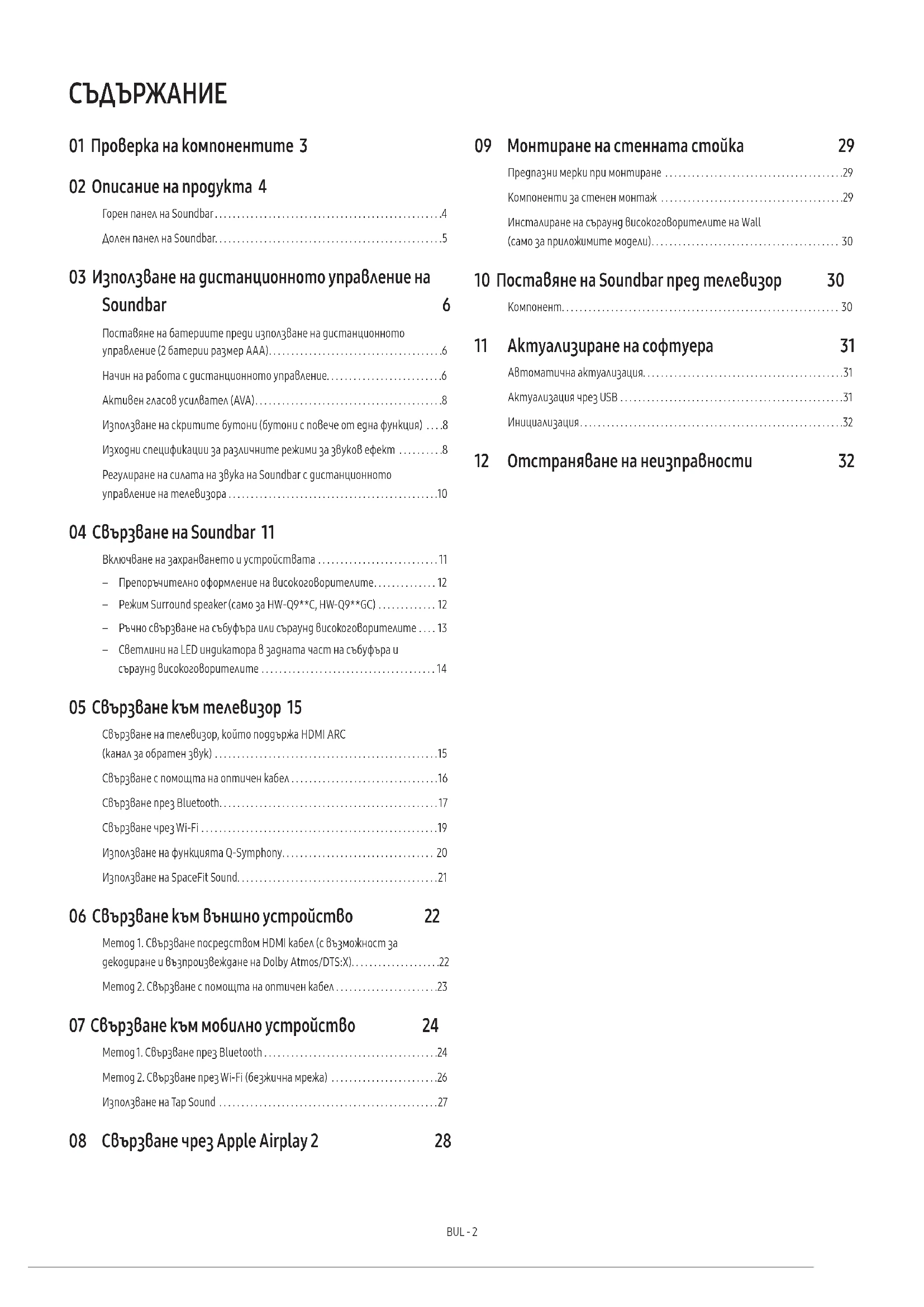 - Инициализация 12 Отстраняване на неизправности 32BUL - 3 01 ПРОВЕРКА НА КОМПОНЕНТИТЕ SOUNDBAR Основно устройство на Soundbar Дистанционно управление/батерии за Soundbar Субуфер POWER x 2 x 4 или 2 Съраунд високоговорител (по избор) (ляв/десен) Захранващ кабел (събуфър, съраунд високоговорител, Soundbar) (по избор) HDMI кабел x 2 x 2 (M4 x L10) Водач за стенна стойка Държач-винт Винт x 2 x 4 Скоба за стенна стойка Гумен крак p. 32