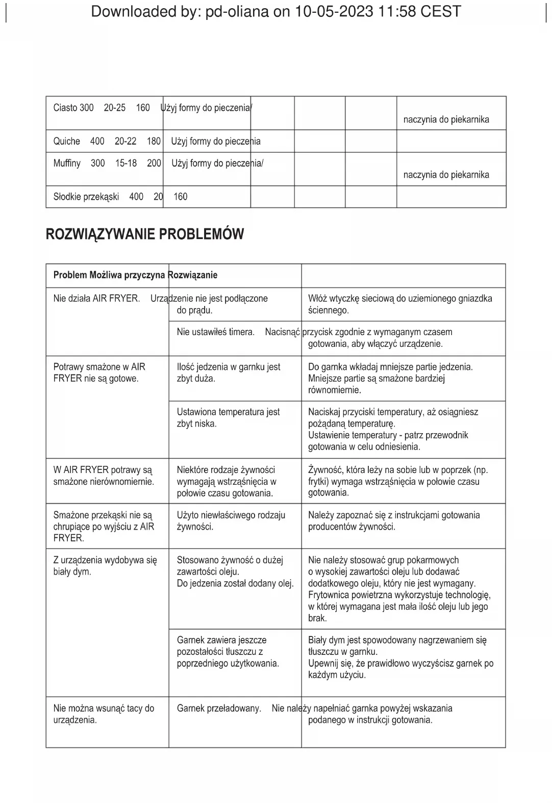 Сладки закуски 400 20 160 Downloaded by: pd-oliana on 10-05-2023 11:58 CESTОТСТРАНЯВАНЕ НА НЕИЗПРАВНОСТИ Проблем Възможна причина Решение Въздушната фритюрница