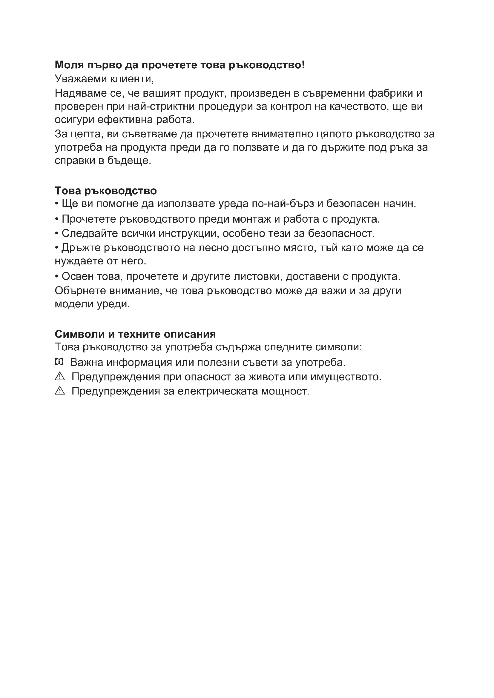 - Освен това, прочетете и другите листовки, доставени с продукта. Обърнете внимание, че това ръководство може да важи и за други модели уреди. Символи и техните описания Това ръководство за употреба съдържа следните символи: C Важна информация или полезни съвети за употреба. A Предупреждения при опасност за живота или имуществото. B Предупреждения за електрическата мощност.BG