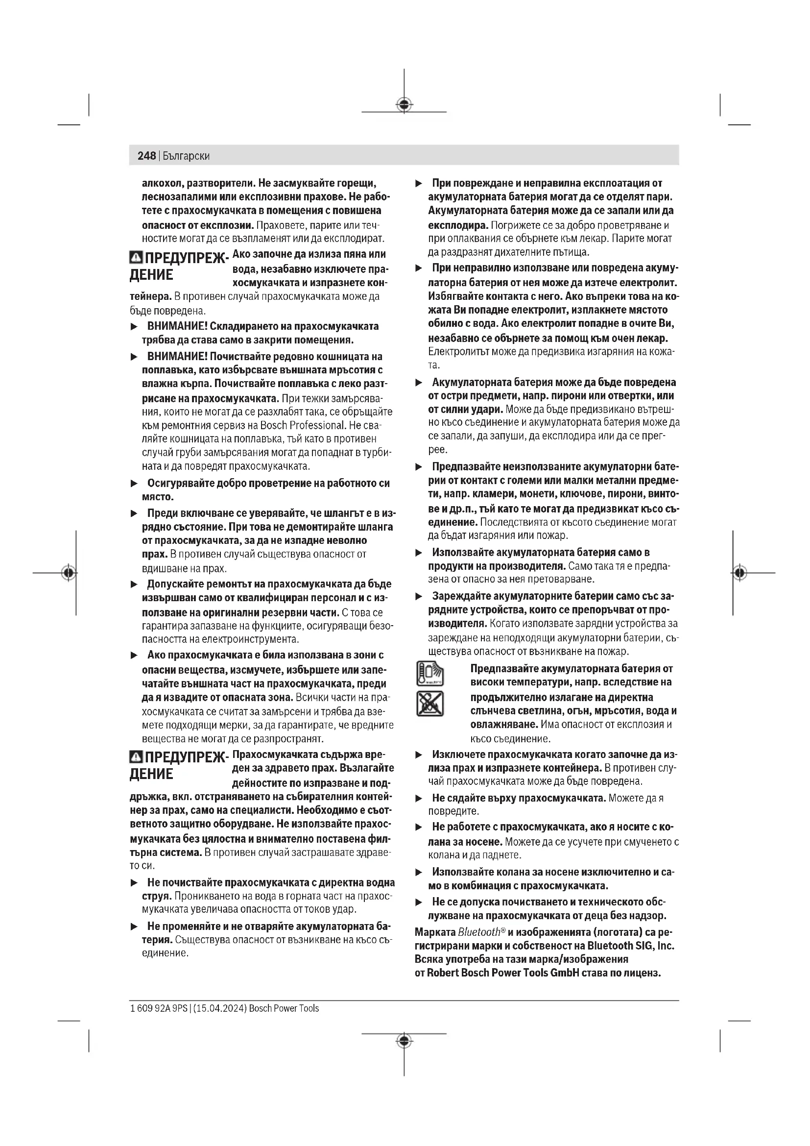 u Не работете с прахосмукачката, ако я носите с ко- лана за носене. Можете да се усучете при смученето с колана и да паднете. u Използвайте колана за носене изключително и са- мо в комбинация с прахосмукачката. u Не се допуска почистването и техническото обс- лужване на прахосмукачката от деца без надзор. Марката Bluetooth® и изображенията (логотата) са ре- гистрирани марки и собственост на Bluetooth SIG, Inc. Всяка употреба на тази марка/изображения отRobertBosch PowerToolsGmbH става по лиценз. 1 609 92A 9PS | (15.04.2024) Bosch Power ToolsБългарски | 249