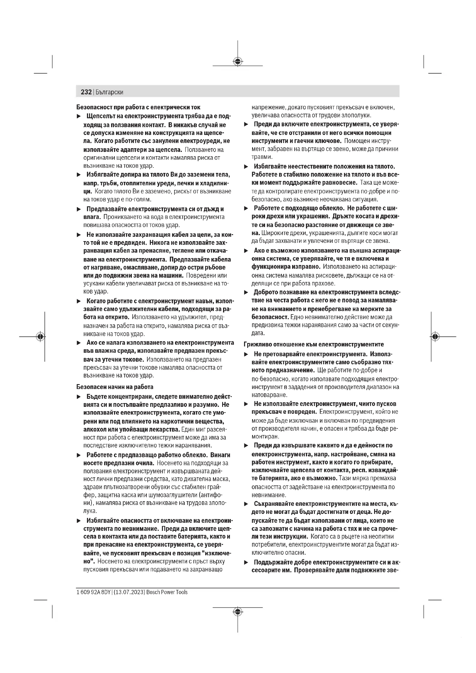 Безопасност на работното място u Пазете работното си място чисто и добре осветено. Разхвърляните или тъмни работни места са предпос- тавка за инциденти. u Не работете с електроинструмента в среда с пови- шена опасност от възникване на експлозия, в бли- зост до леснозапалими течности, газове или прахо- образни материали. По време на работа в електроин- струментите се отделят искри, които могат да възпла- менят прахообразни материали или пари. u Дръжте деца и странични лица на безопасно разсто- яние, докато работите с електроинструмента. Ако вниманието Ви бъде отклонено, може да загубите кон- трола над електроинструмента. Bosch Power Tools 1 609 92A 8DY | (13.07.2023)232 | Български Безопасност при работа с електрически ток u Щепселът на електроинструмента трябва да е под- ходящ за ползвания контакт. В никакъв случай не се допуска изменяне на конструкцията на щепсе- ла. Когато работите със занулени електроуреди, не използвайте адаптери за щепсела. Ползването на оригинални щепсели и контакти намалява риска от възникване на токов удар. u Избягвайте допира на тялото Ви до заземени тела, напр. тръби, отоплителни уреди, печки и хладилни- ци. Когато тялото Ви е заземено, рискът от възникване на токов удар е по‑голям. u Предпазвайте електроинструмента си от дъжд и влага. Проникването на вода в електроинструмента повишава опасността от токов удар. u Не използвайте захранващия кабел за цели, за кои- то той не е предвиден. Никога не използвайте зах- ранващия кабел за пренасяне, теглене или откача- ване на електроинструмента. Предпазвайте кабела от нагряване, омасляване, допир до остри ръбове или до подвижни звена на машини. Повредени или усукани кабели увеличават риска от възникване на то-