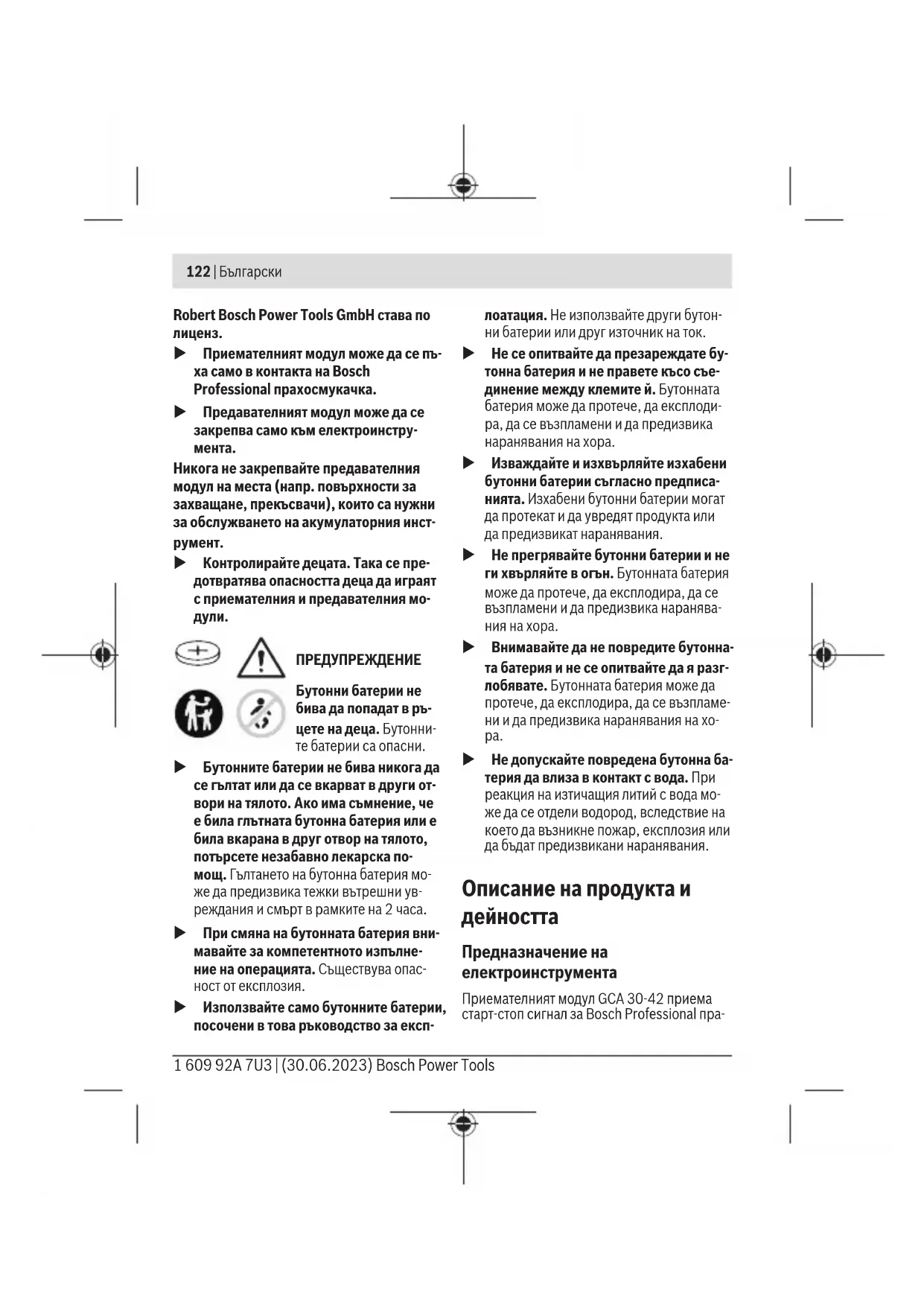 Указания за сигурност Всички указания трябва да се прочетат и да се спазват, за да може да се работи бе- зопасно и сигурно сGCA30-42 иGCT 30-42. Съхранявайте добре тези указа- ния и ги предавайте при предаване наGCA30-42 и наGCT 30-42. Наименованието Bluetooth® както и гра- фичните елементи (лога) са регистрира- ни търговски марки на фирма Bluetooth SIG, Inc. Ползването на това наименова- ние и на графичните елементи от фирма Bosch Power Tools 1 609 92A 7U3 | (30.06.2023)122 | Български Robert Bosch Power Tools GmbH става по