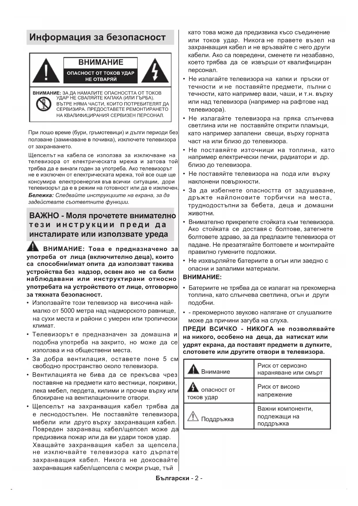 ОПАСНОСТ ОТ ТОКОВ УДАРНЕ ОТВАРЯЙВНИМАНИЕ: ЗА ДА НАМАЛИТЕ ОПАСНОСТТА ОТ ТОКОВ УДАР НЕ СВАЛЯЙТЕ КАПАКА (ИЛИ ГЪРБА). ВЪТРЕ НЯМА ЧАСТИ, КОИТО ПОТРЕБИТЕЛЯТ ДА СЕРВИЗИРА. ПРЕДОСТАВЕТЕ РЕМОНТИРАНЕТО НА КВАЛИФИЦИРАНИЯ СЕРВИЗЕН ПЕРСОНАЛ.Бележка: Следвайте инструкциите на екрана, за да задействате съответните функции.При лошо време (бури, гръмотевици) и дълги периоди без ползване (заминаване в почивка), изключете телевизора от захранването.Щепселът на кабела се използва за изключване на телевизора от електрическата мрежа и затова той трябва да е винаги годен за употреба. Ако телевизорът не е изключен от електрическата мрежа, той все още ще консумира електроенергия във всички ситуации, дори телевизорът да е в режим на готовност или да е изключен. ВАЖНО - Моля прочетете внимателно тези инструкции преди да инсталирате или използвате уреда ВНИМАНИЕ: Това е предназначено за употреба от лица (включително деца), които са способни/имат опита да използват такива устройства без надзор, освен ако не са били наблюдавани или инструктирани относно употребата на устройството от лице, отговорно за тяхната безопасност.
